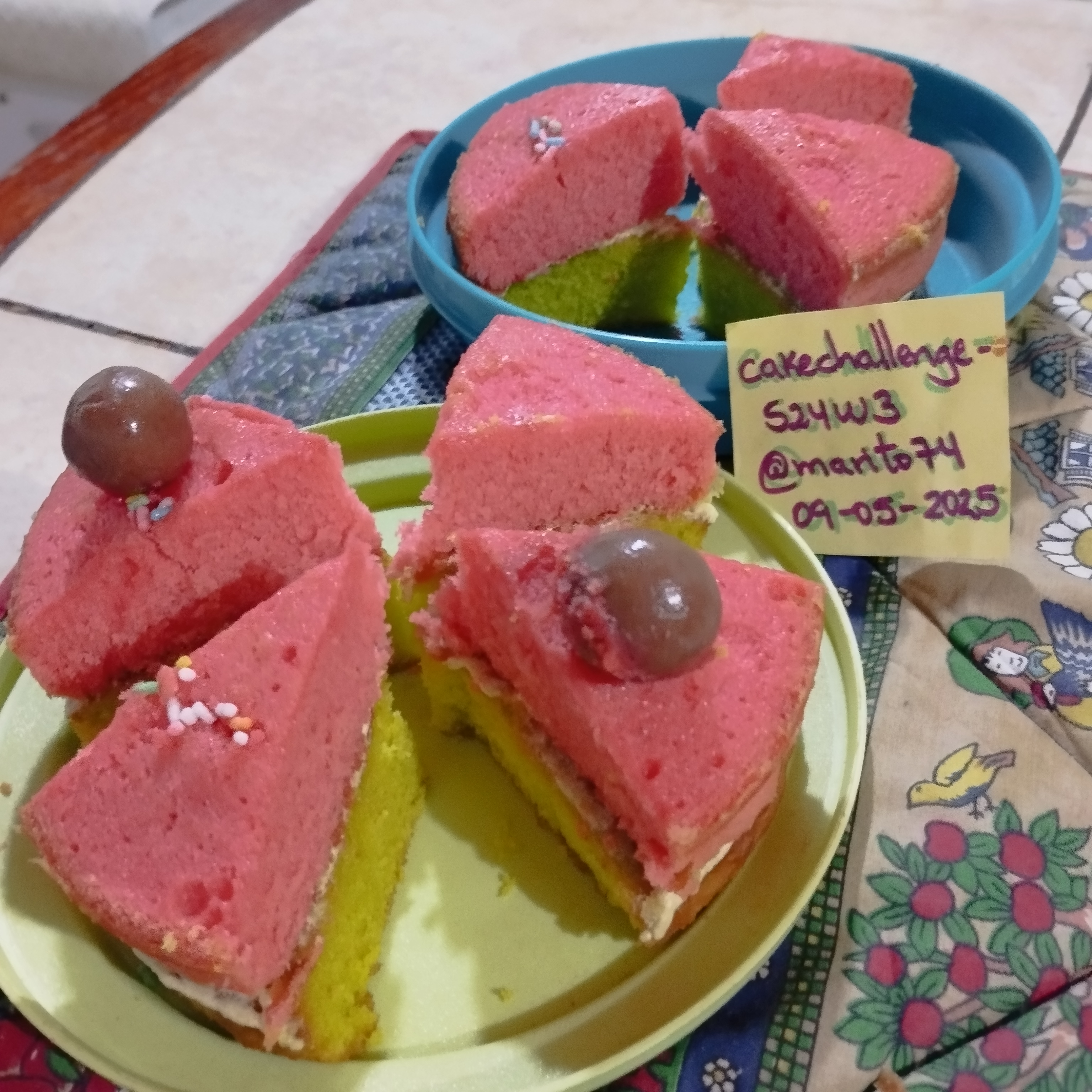 Hola amiga lo mejor de este reto fue que cocinaste el pastel junto a tu hija y ambas se encargaron de hacer una parte del pastel del color elegido y luego lo armaste se ve muy esponjoso y suave