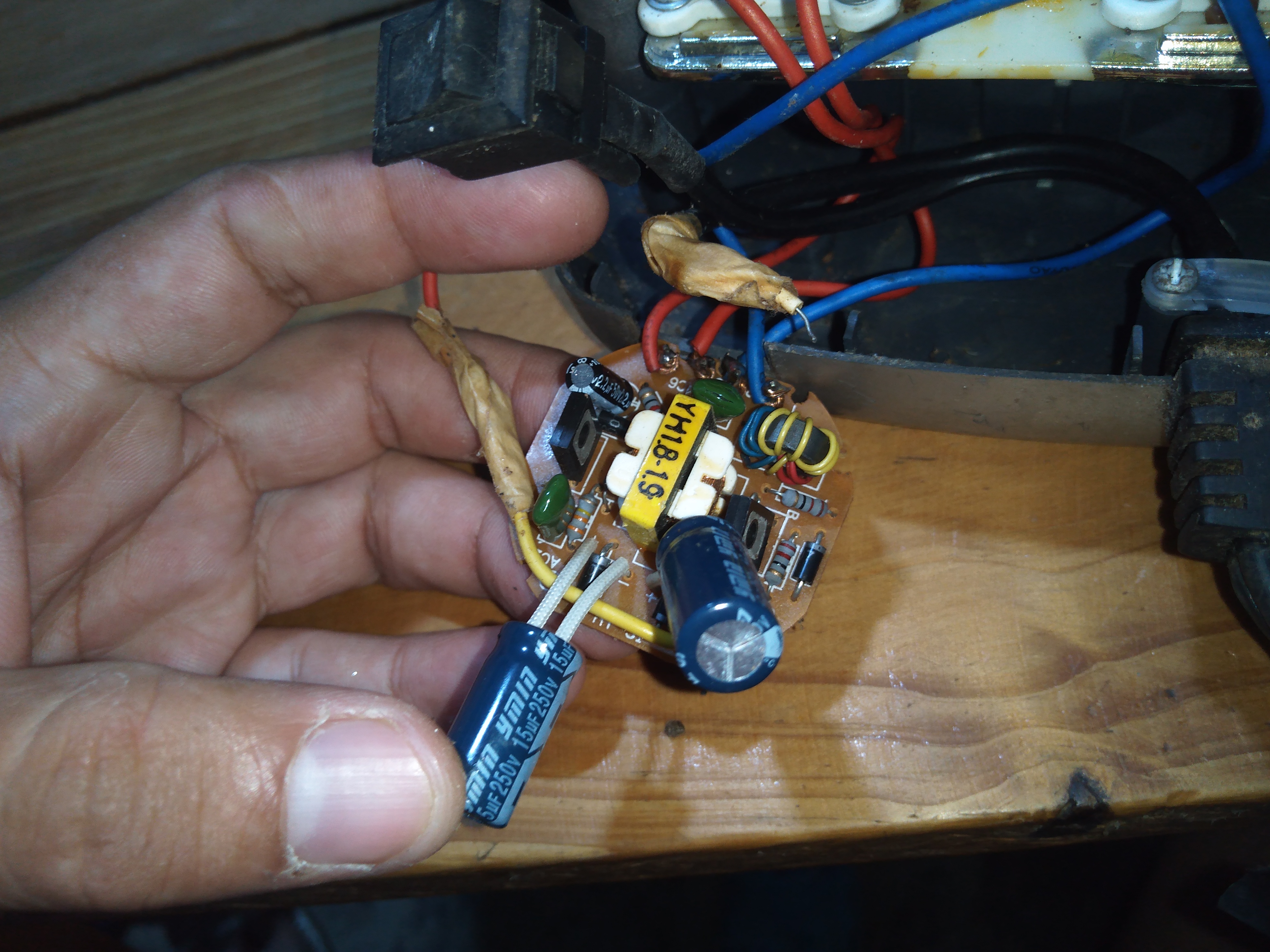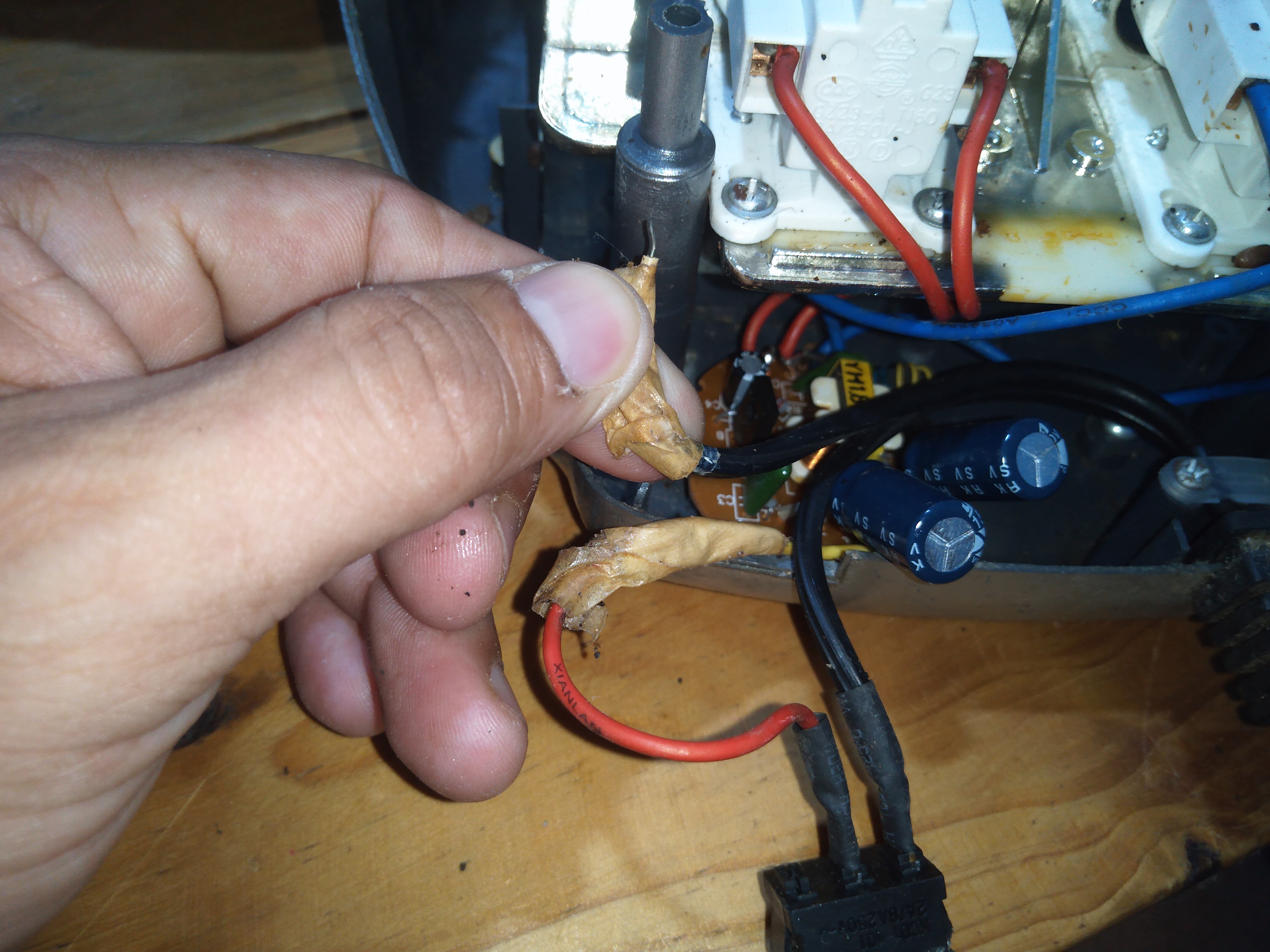 Observen el la imágen siguiente, aquí pueden ver que sostengo un alambre suelto, ese alambre viene del cable de alimentación de corriente, es decir una línea 110v AC, por esa razón escuchó un chispazo fuerte.