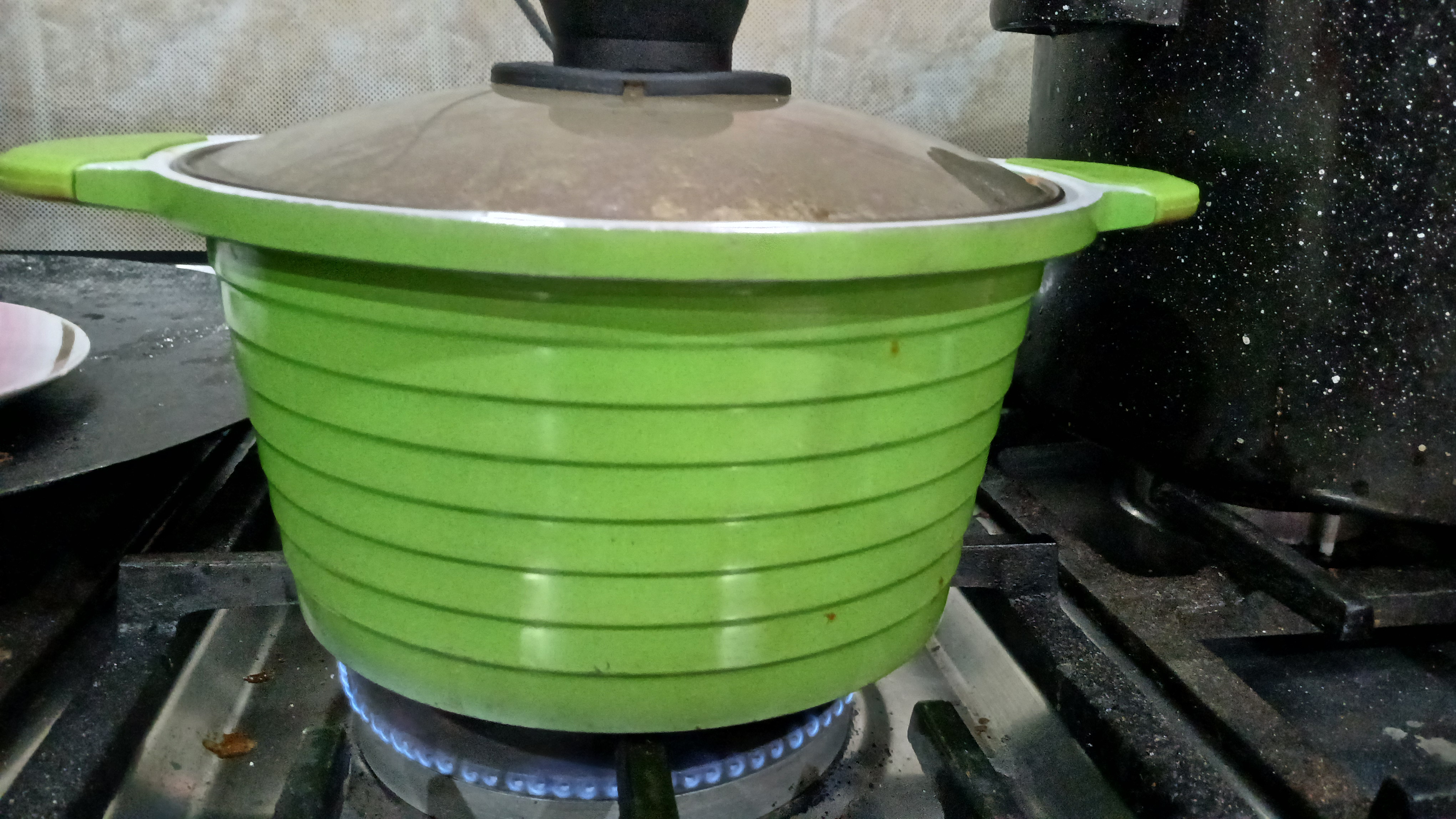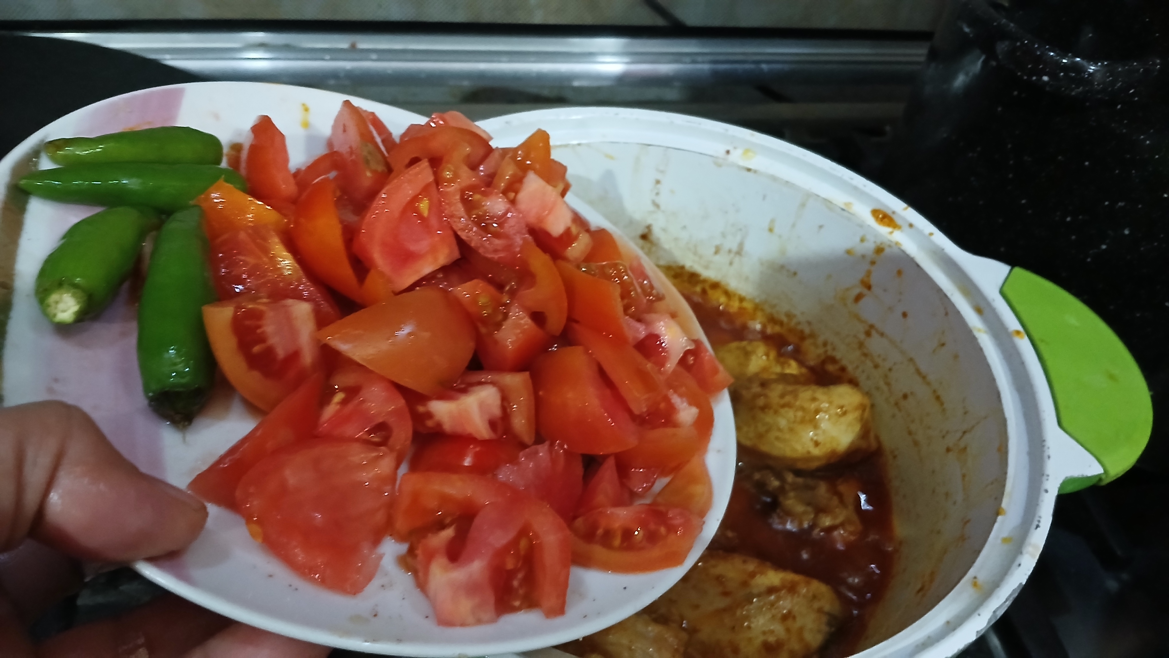 - Add tomatoes and green chillies in it and fry until all mixed together then add water in it and turn flame to very low . Cook it for 40min