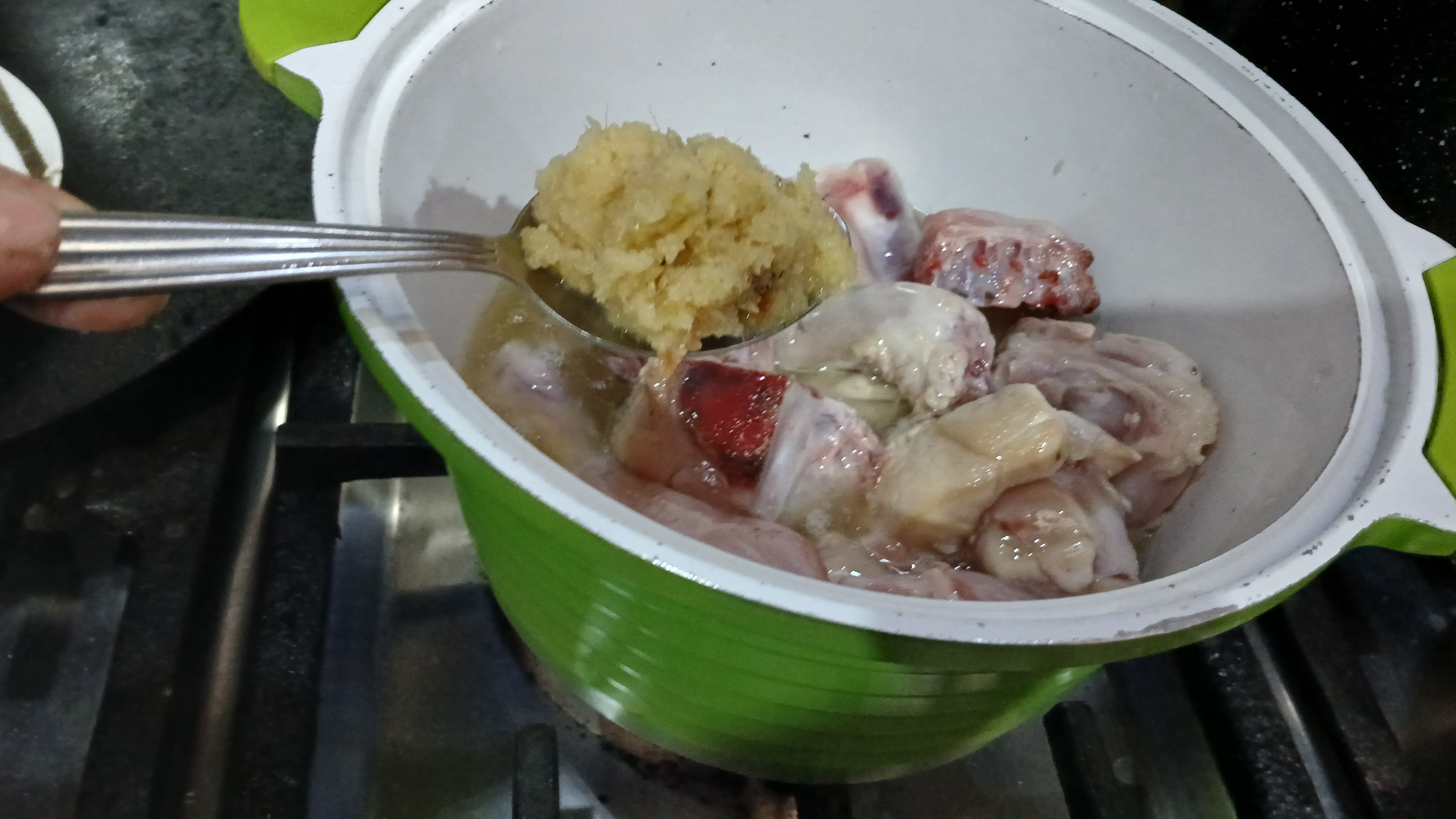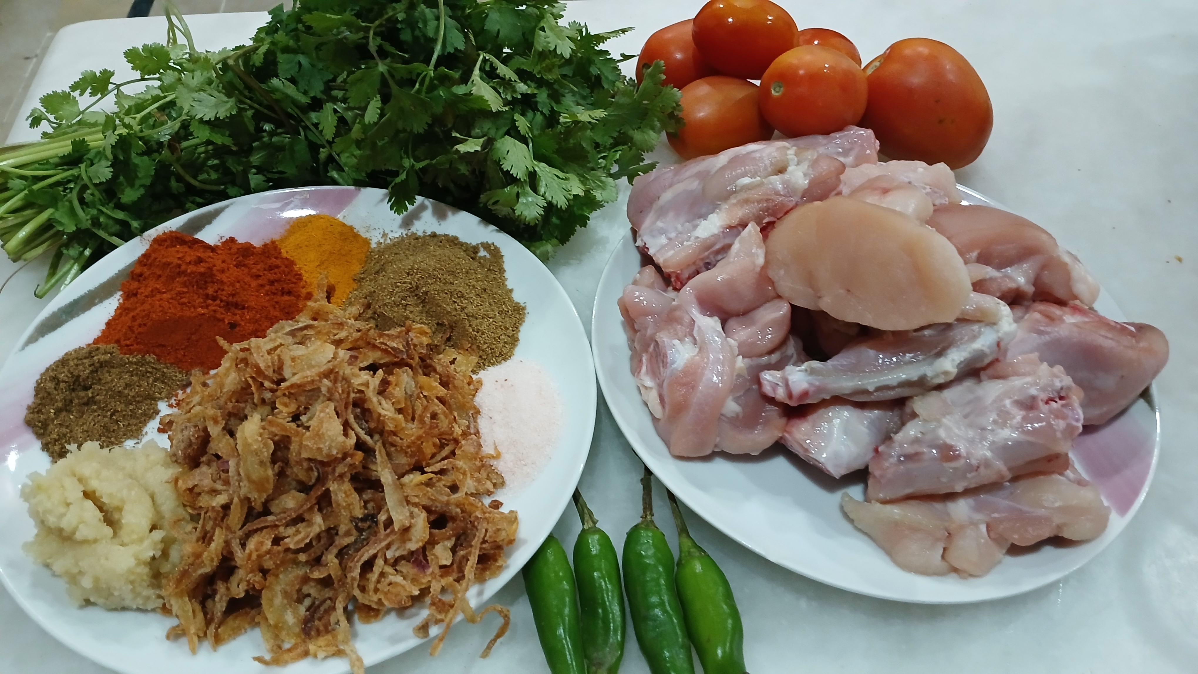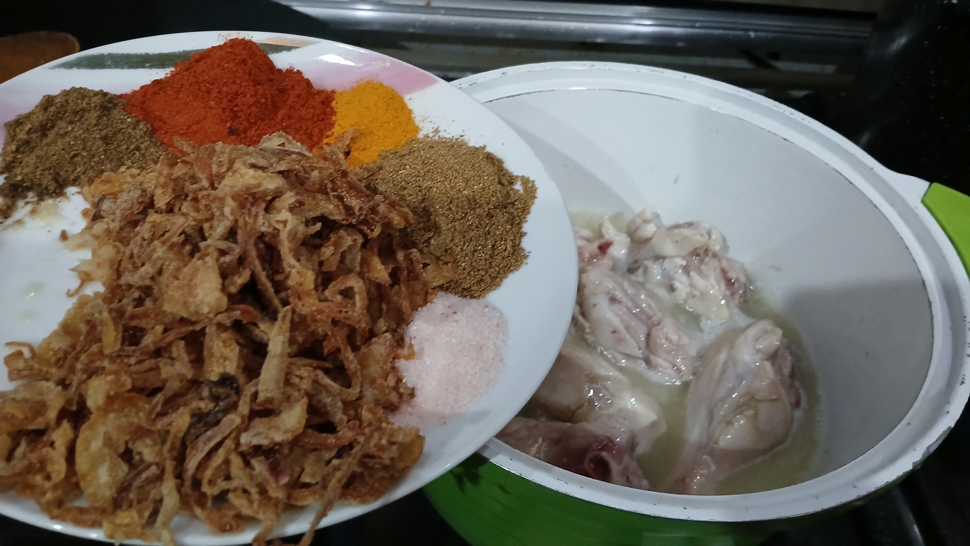 - Take some oil in a pan and chicken in it and fry it until its colour changes then add garlic ginger paste sotey it for few minutes. Add all spices and fried onions in it and fry until aroma arises.