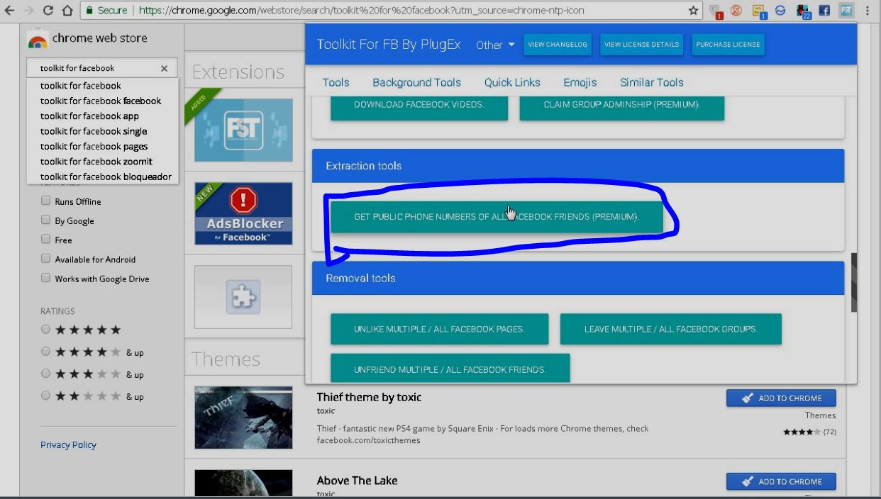 2. Now, click the toolkit option and scroll down to- Extraction Tools> Get Public Phone Numbers of All Facebook Friends (Premium) and click it.