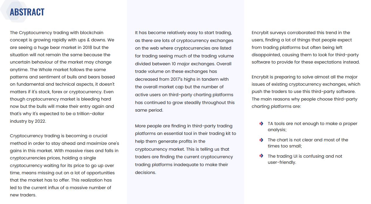 Hence, Encrybit ICO and its platform want to resolve those issues, trying to give users almost all the equipment they want, all in one single page when you need them and extremely simple to use, simply no switching dividers and simply no want of third-party systems, "Most you want, all of them in one web page". It does not matter you're trading for fun or function; all the investor groups will end up being provided the possibility to trade in an even more calm and participating method using the Encrybit ICO.