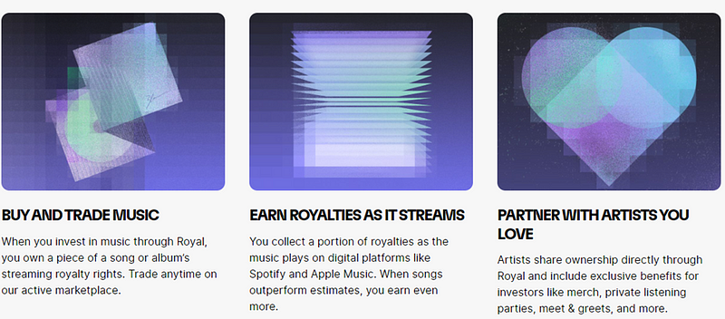 Il appartient à l'artiste de choisir discrétionnairement le pourcentage de droits musicaux qui sera alloué à la plateforme. L'achat d'un jeton représentant une chanson ou un album donne à un utilisateur le droit de percevoir des redevances une fois que cette chanson ou cet album est diffusé sur les plateformes de streaming. Les détenteurs de jetons reçoivent leur part des redevances lorsque les artistes sont payés. En juillet 2022, Royal a effectué son premier paiement de redevances aux détenteurs de jetons. Un montant de 36 000 $ a été distribué aux détenteurs de quatre chansons : "Ultra Black" (Nas), "Rare" (Nas), "He’s Not You" (Vérité) et "Worst Case" (3LAU).