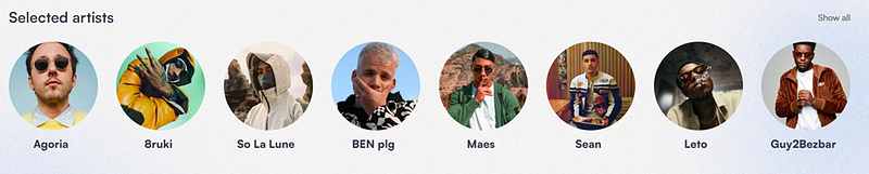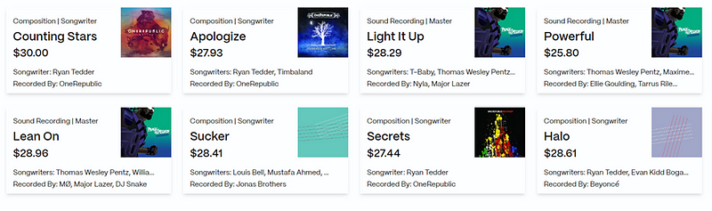 JKBX se distingue par plusieurs aspects. Tout d'abord, la qualité et la popularité des artistes présents sur la plateforme. Bien qu'il y ait eu de bonnes offres sur d'autres projets, de nombreux morceaux sur ces plateformes laissent à désirer. Des chansons et des artistes populaires sont nécessaires à la plateforme pour attirer des clients. Et en tant qu'investissement, les pistes célèbres ont plus de sens en raison de leur puissance de streaming. C'est là que JKBX peut surpasser ses concurrents, je crois. Au moment de la rédaction de cet article (29 septembre 2023), la plateforme propose de nombreux enregistrements sonores de pistes populaires :