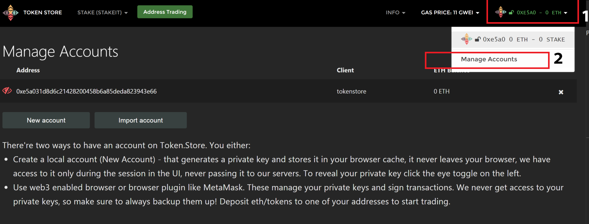 Once you visit the exchange, you will be able to see a new account readily created for you on the top-right corner of the website. Click on your "account -> Manage Accounts" to create/delete new accounts or import existing ETH wallet addresses via private key.