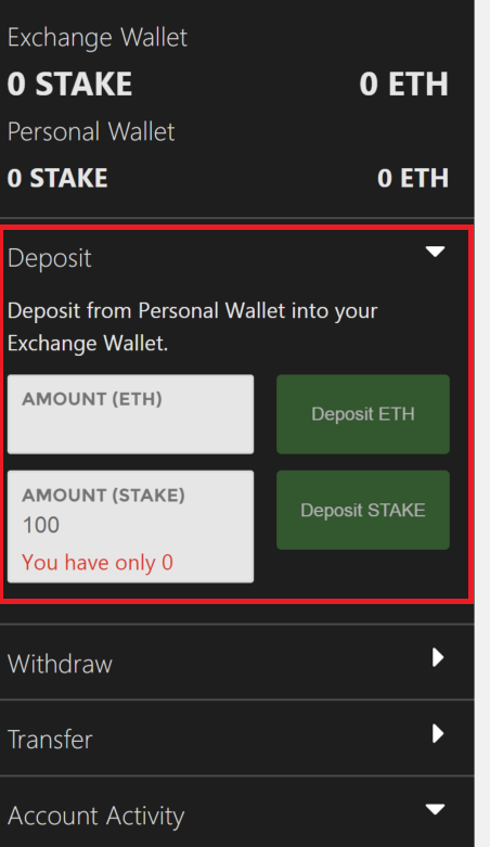 You can now start depositing ETH & Tokens on the exchange. There are options for you to 'deposit' and 'withdraw' as well as to view your 'account activity' on the left corner of the website.