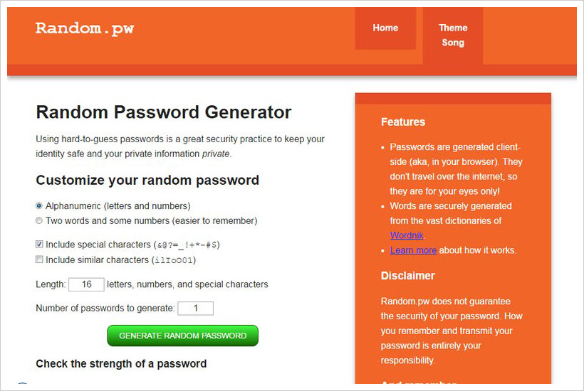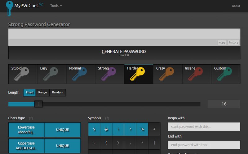 MyPWD.net has a sleek interface and comes with preset profiles to create passwords according to your need. You can use strength profiles such as easy, strong, harder or insane to generate a strong password. You can also manually adjust setting to generate a password.
