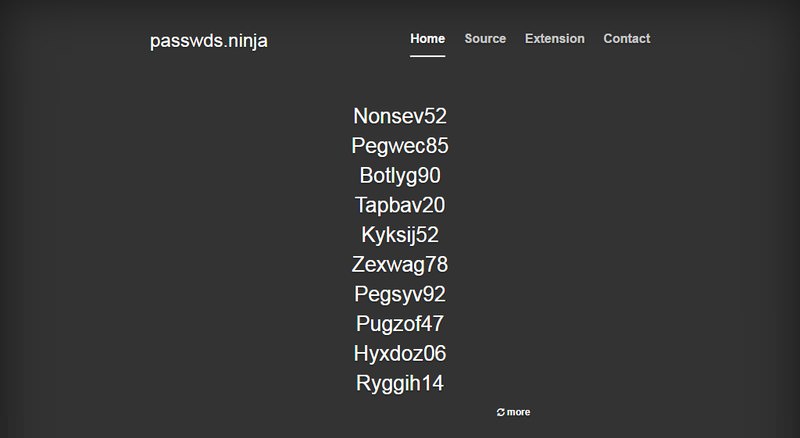 Definitely not the most secure password generator, but it is really fast and easy to use. Passwds.ninja shows a list of 8 character length passwords with random pronounceable letters and numbers.