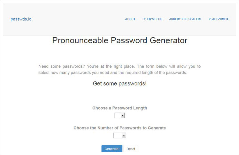 A very easy to use pronounceable password generator, passwds.io lets you create up to 100 passwords at a time without any confusing configurations. Simply select password length and how many you need, and you will get the list of passwords. Good for novice users.