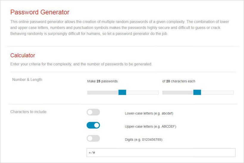 You can generate up to 50 random passwords with Norton password Generator. You have all the options like the ability to adjust case, use letters, numbers, and characters. However, I noticed it doesn’t extensively use characters and letters, which does make it a little easy to remember but I guess it’s less secure as well.