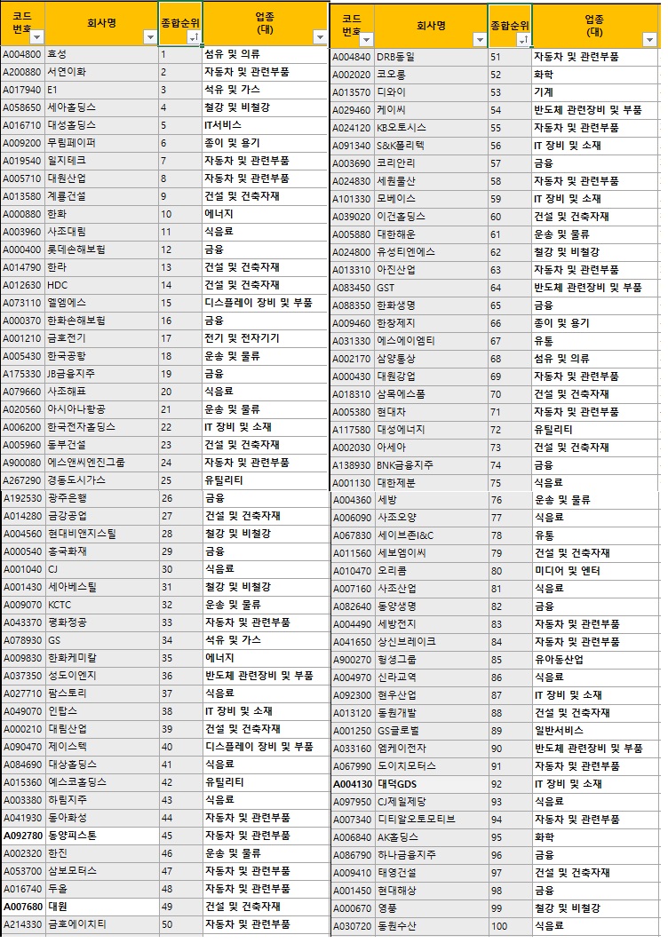 아래의 조건으로 검색된 624개 기업에서 다시 순위를 매겨 100위 기업을 선정했습니다.