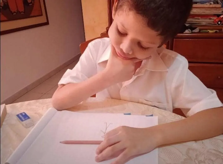 A simple vista el niño, está demostrando que en el hogar también se aprende, con gestos que delatan que los padres le han inculcado valores, principios y el hábito de cumplir con la asignación en el horario establecido. También me llama la atención que a la hora del estudio con las herramientas básicas como papel, hoja, lápiz y mente con la ausencia de elementos distractores como celulares o tablets.