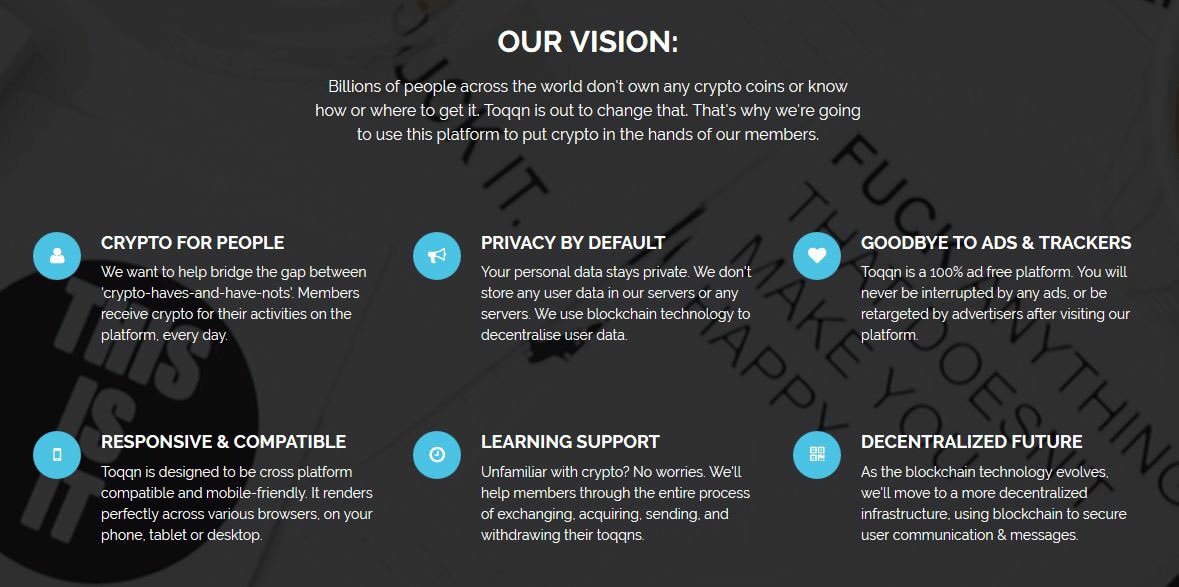 - Toqqn is a new generation of social platform on the online, they application blockchain technology and AI technology into your project now . Fortunately, they having nice core team working and a strong road map for support people transaction with them now.