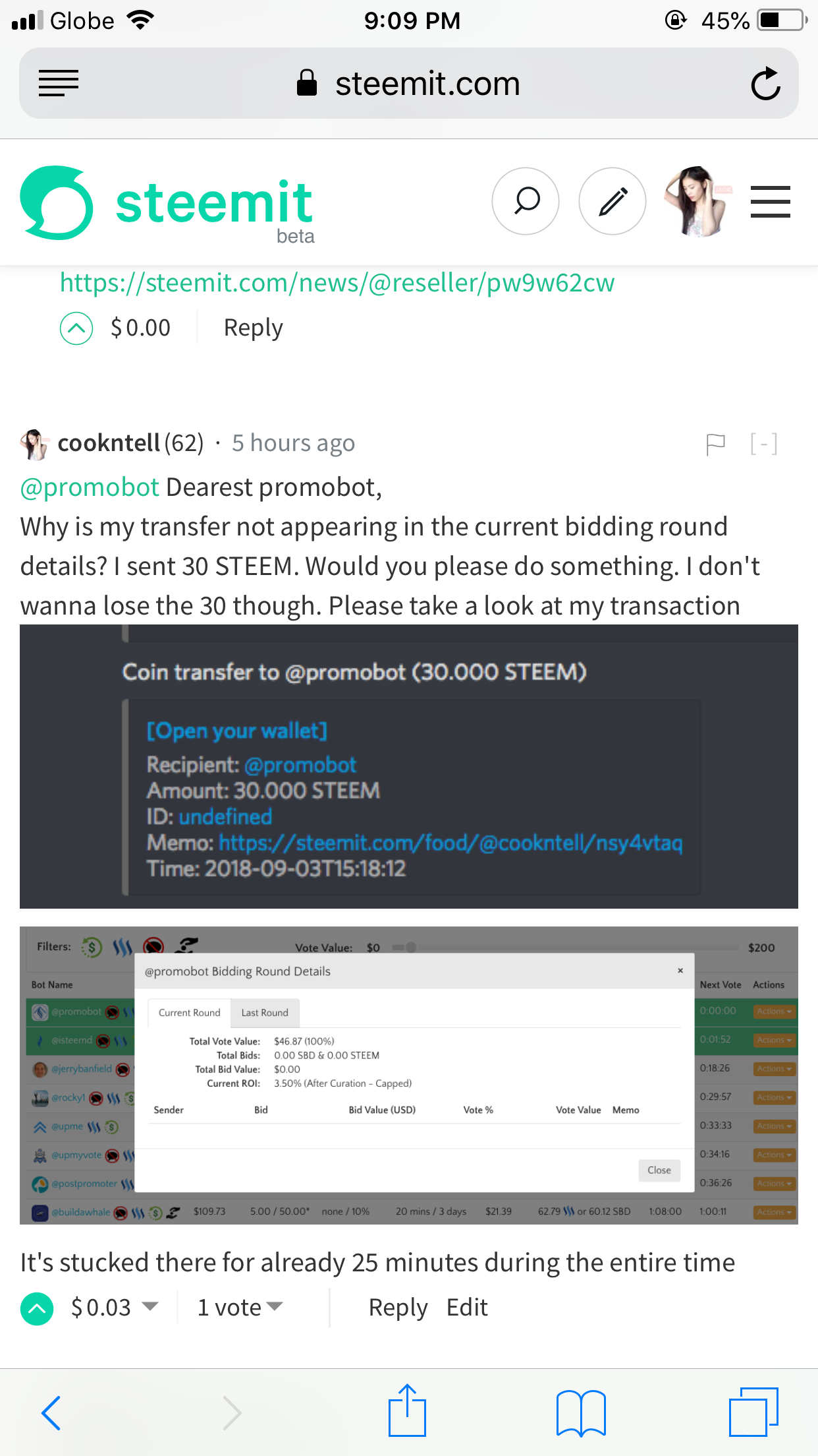 Why is my transfer not appearing in the current bidding round details? I sent 30 STEEM. Would you please do something. I don't wanna lose the 30 though. Please take a look at my transaction