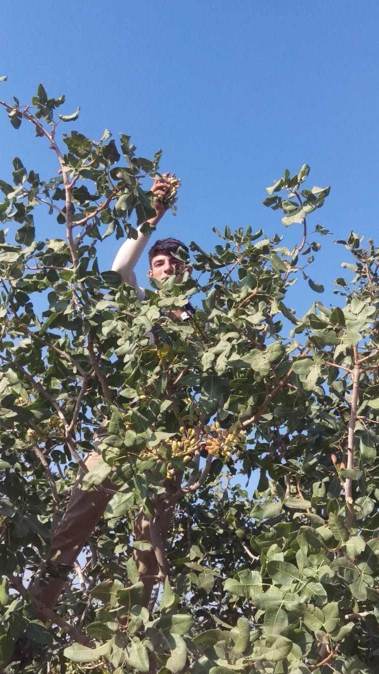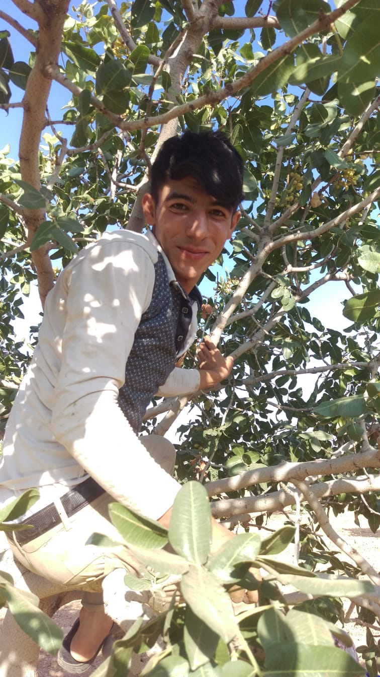 İşte resimdeki gibi bu şekilde ağaca çıkıp fıstıkları sirkeliyorum. Ailemle birlikte fıstık işiyle ilgileniyorum. Isim sürekli tarlalarda geçiyor. Bu ağaçların hepsini büyüttük. Ben 6 yaşından beridir. Bu ağaçlarla baktım büyüttük. Bizim buralarda hep böyle küçüklükten başlarız işe evin tek erkek çocuğuyum. Benden büyük ablalarim ve kız kardeşlerim var. Gerçekten evin tek erkek çocuğu olmak çok zor. Bütün yük bende oluyor. Tarım işinde gerçekten de birikim olmuyor. İ