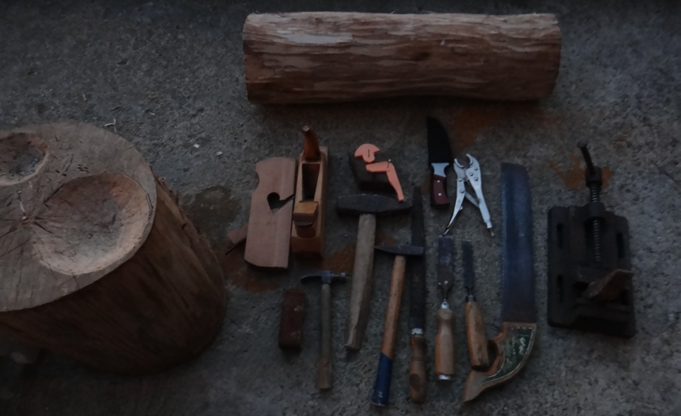 [TR] Kullandığım aletlerin tamamı bunlar. Fotoğraftaki büyük kütük mahallemizde yaşayan yaşlı bir amca tarafından bana verilmişti. Crossbow için o kütüğü kullandım. Yakınlardaki bir marangoz atölyesine gidip, sahibinden kütüğü 6 parçaya bölmesini rica ettim. Diğer aletler 2007 de ölen rahmetli dedeme aittir. Herangi bir elektrikli alet kullanmadım çünkü ortaçağ zamanından bir insan bunları yaparken neler hissediyordu onu deneyimlemek istedim.