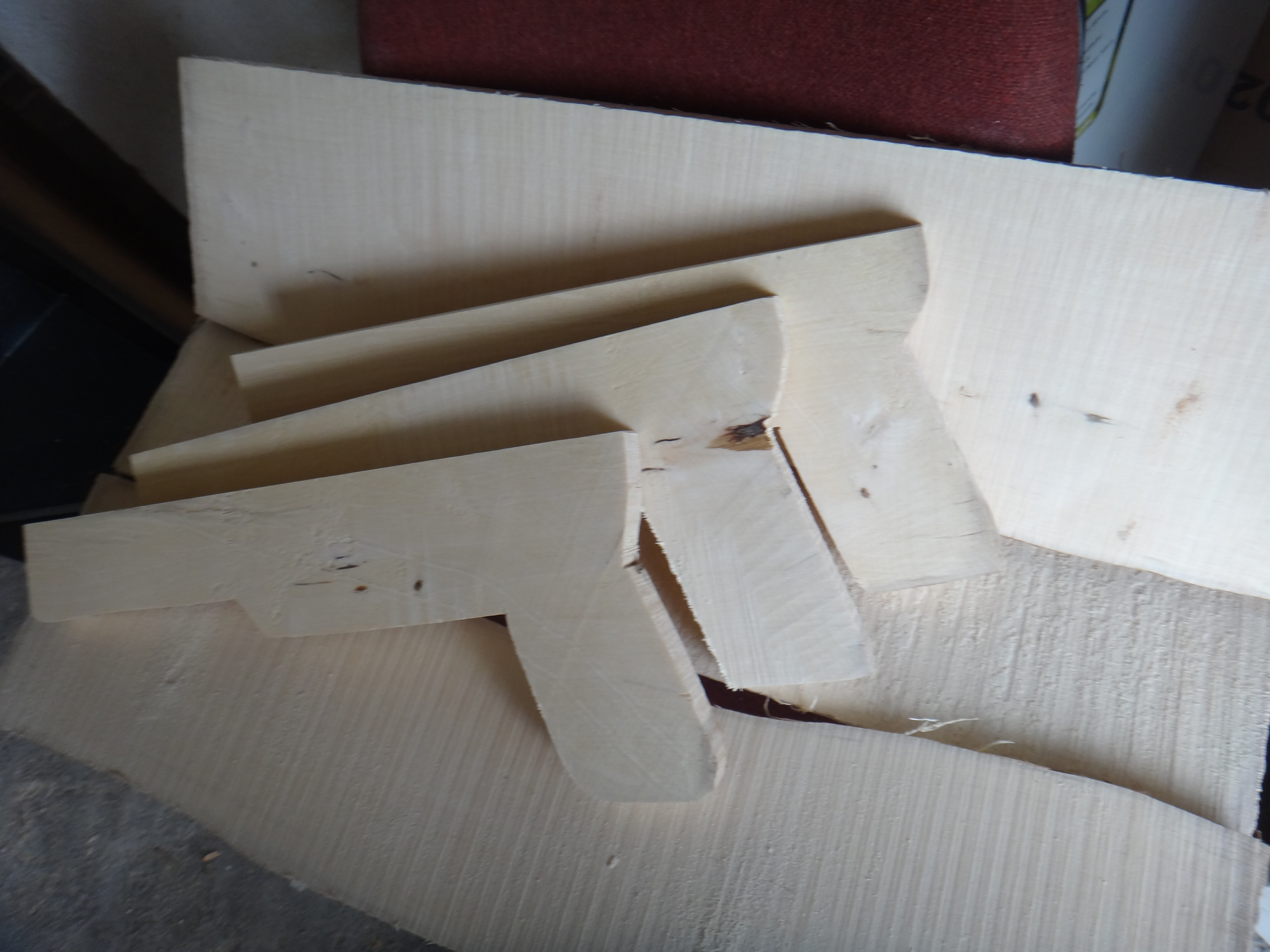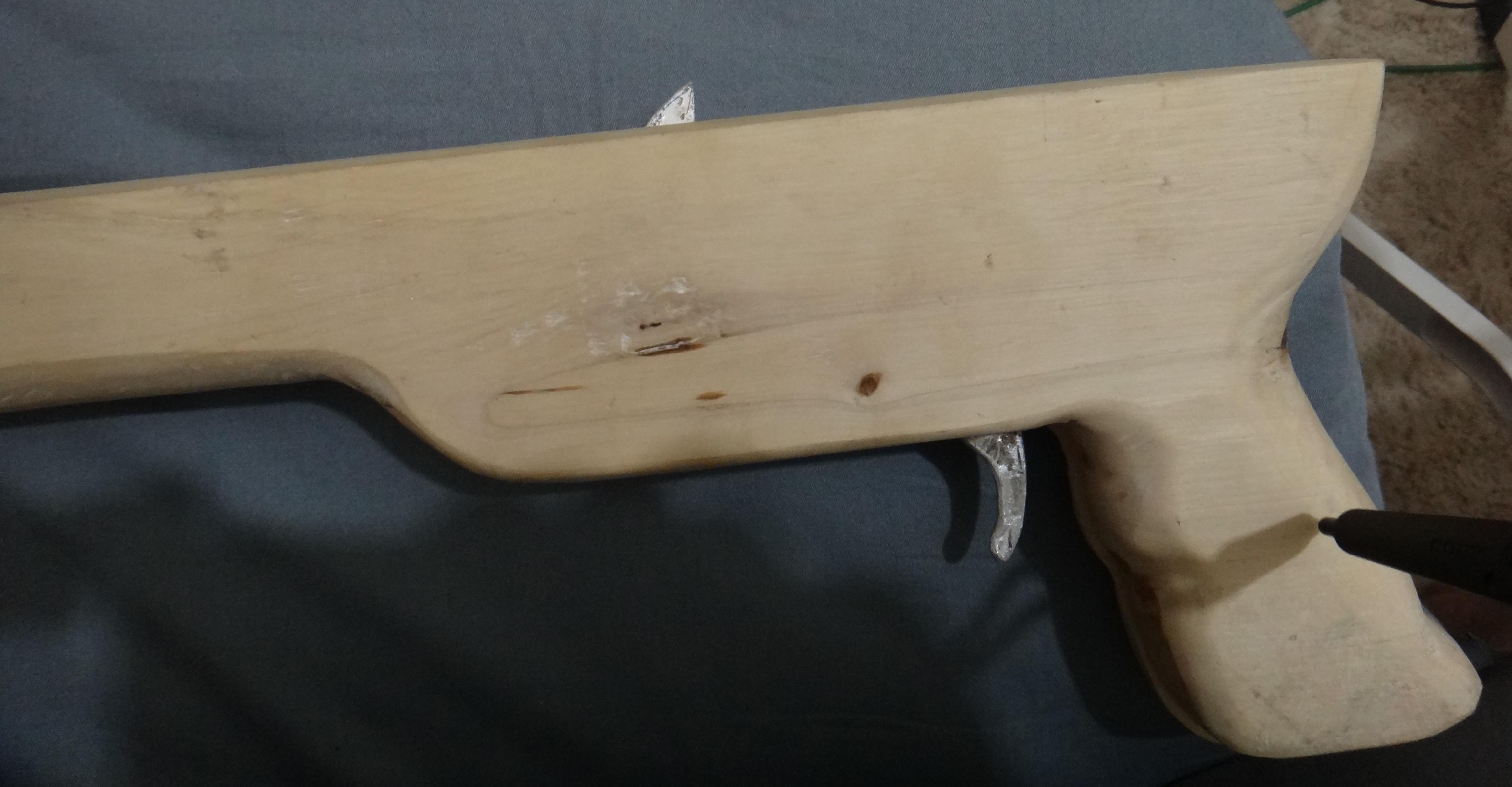 [TR] 3 tane parça kesmemin sebebi ise tetik mekanizması. Alüminyum parçadan oluşan tetik mekanizmasının çalışması için tahtaya mekanizmanın rahatça hareket edebileceği oyuklar açmam gerekiyordu. Elimde bu oyukları açacak malzemem olmadığı için 3 parça kestim. Ortadaki parçaya tetik için yer açmak tek başına testere ile daha kolay. Tetik mekanizması yerçekimini kullanarak çalışıyor. Çok detaya girmek istemiyorum merak edenler internetten araştırıp daha detaylı açıklamalar bulabilirler.