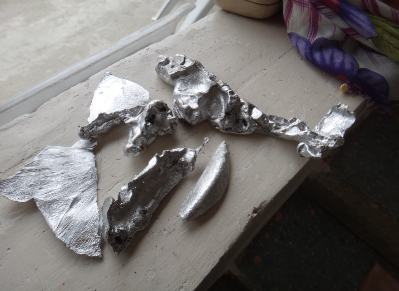 Tetik mekanizması için bir kaç prototip yaptım ,köpükten , kartondan ince alüminyumdan olmak üzere. Sistemin verimli çalışması için bana en az 1cm kalınlığında bir alüminyum parça gerekiyordu. Ne yazıkki tüm uğraşlarıma ve arayışlarıma rağmen bulamadım böyle bir parça. Pes etmedim tabiki. Atölyede sağda solda bulduğum alüminyum tepsiler vardı ( ramazandan kalma baklava tepsileri ) onları küçük küçük parçalara ayırıp, yaptığım ocakta taş kömürüyle ısıtıp erittim. İlk yaptığım kalıp ıslak kumdandı ve sonuç başarısız oldu tabiki.