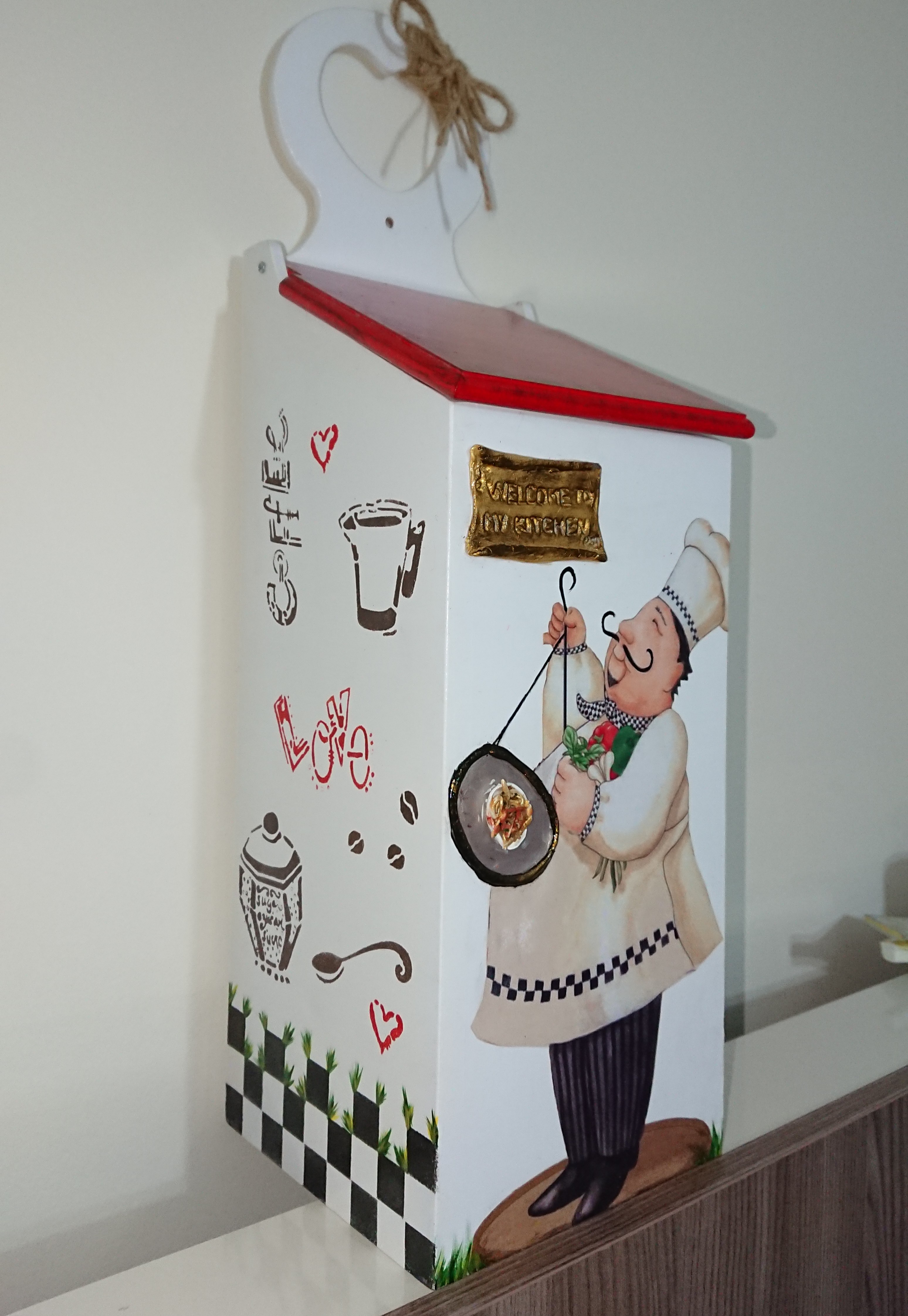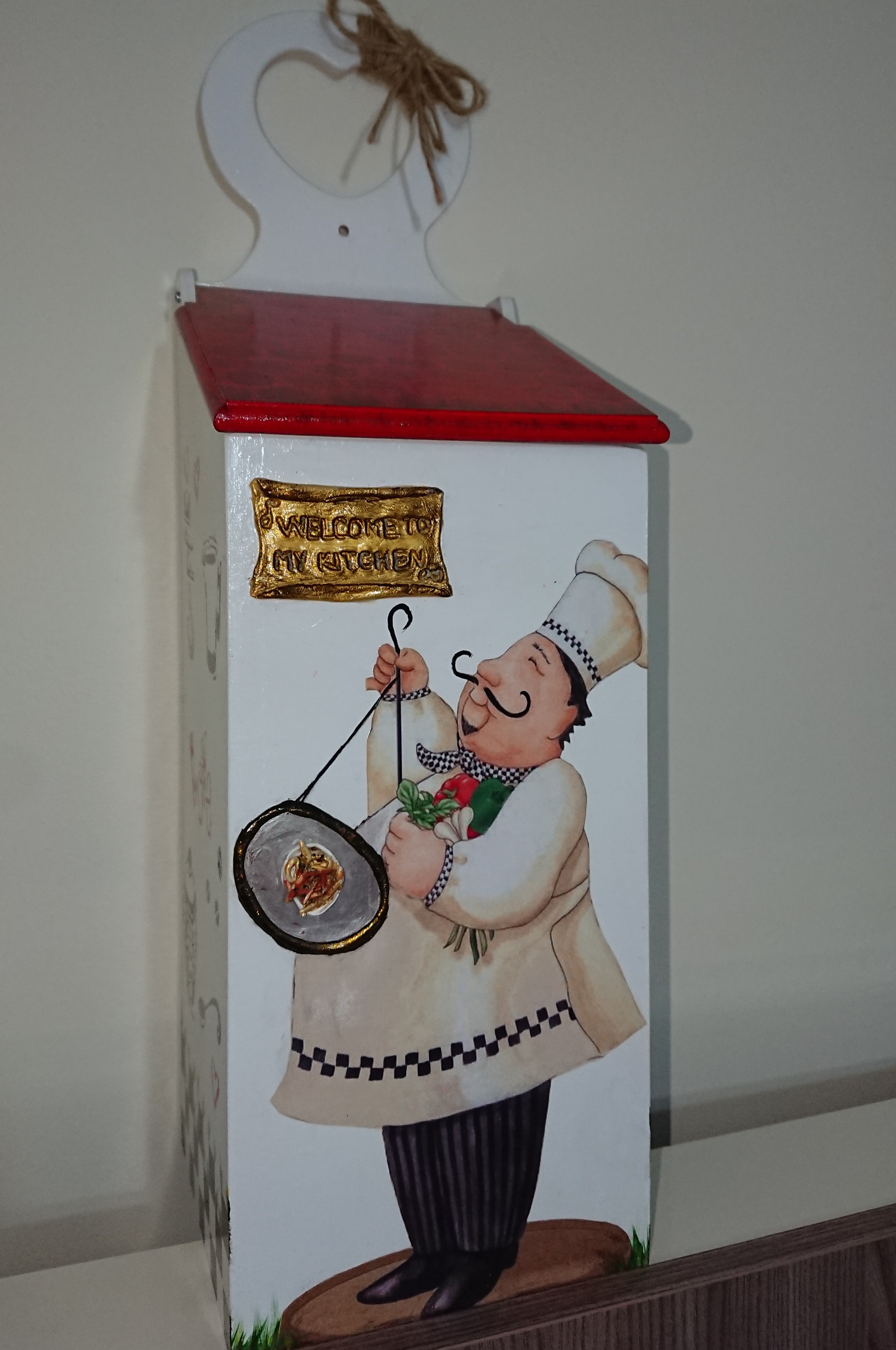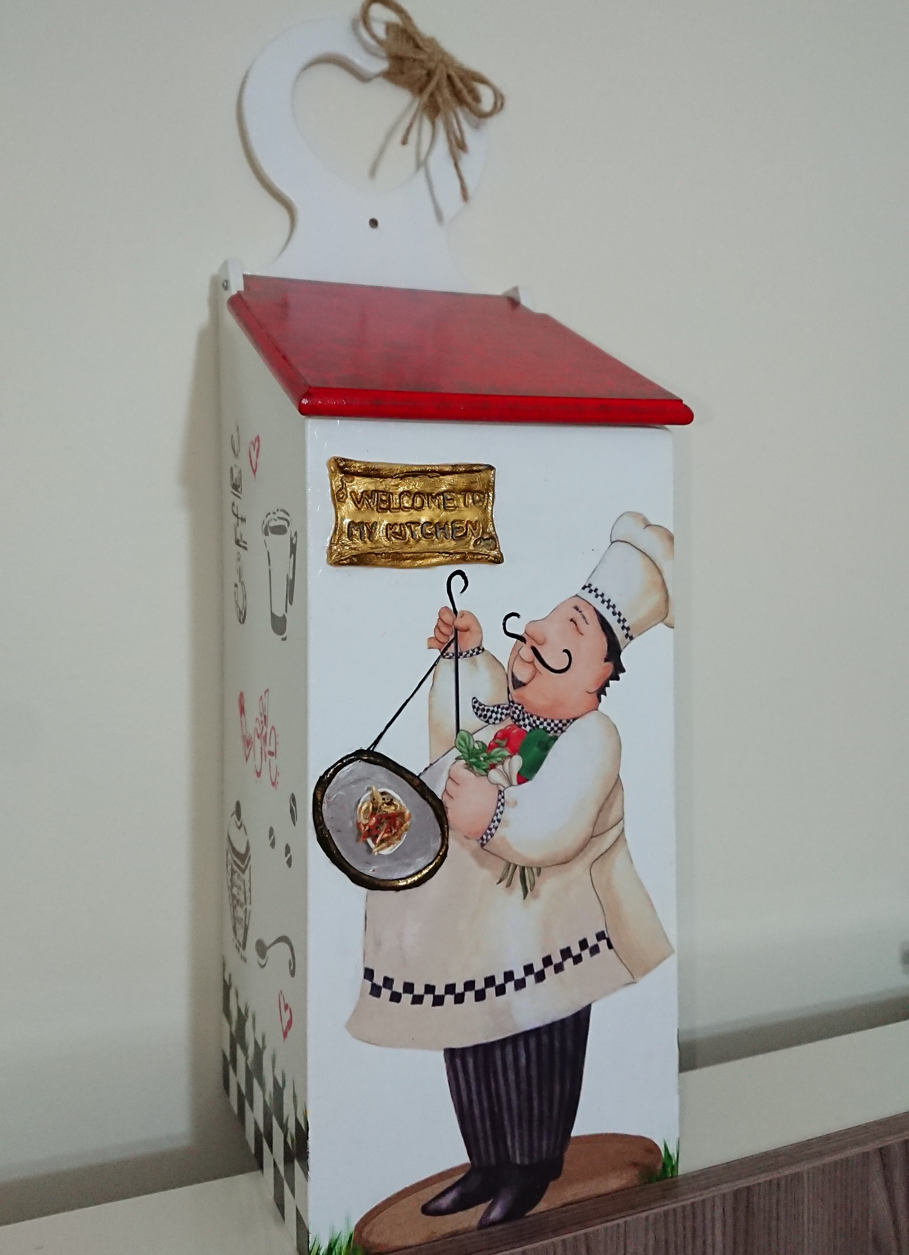 Detaylardan bahsetmek gerekirse ön yüzündeki aşçı adam dekopaj fakat karnından bir kısmı kesilmek zorunda olduğu için boyama ile tamamladım o elindeki tepsimiz yoktu, tepsi çizerek içine hamurdan makarnalar yaparak tamamladım. Ki makarna da ketçap, nane, pulbiber bile var. 😂