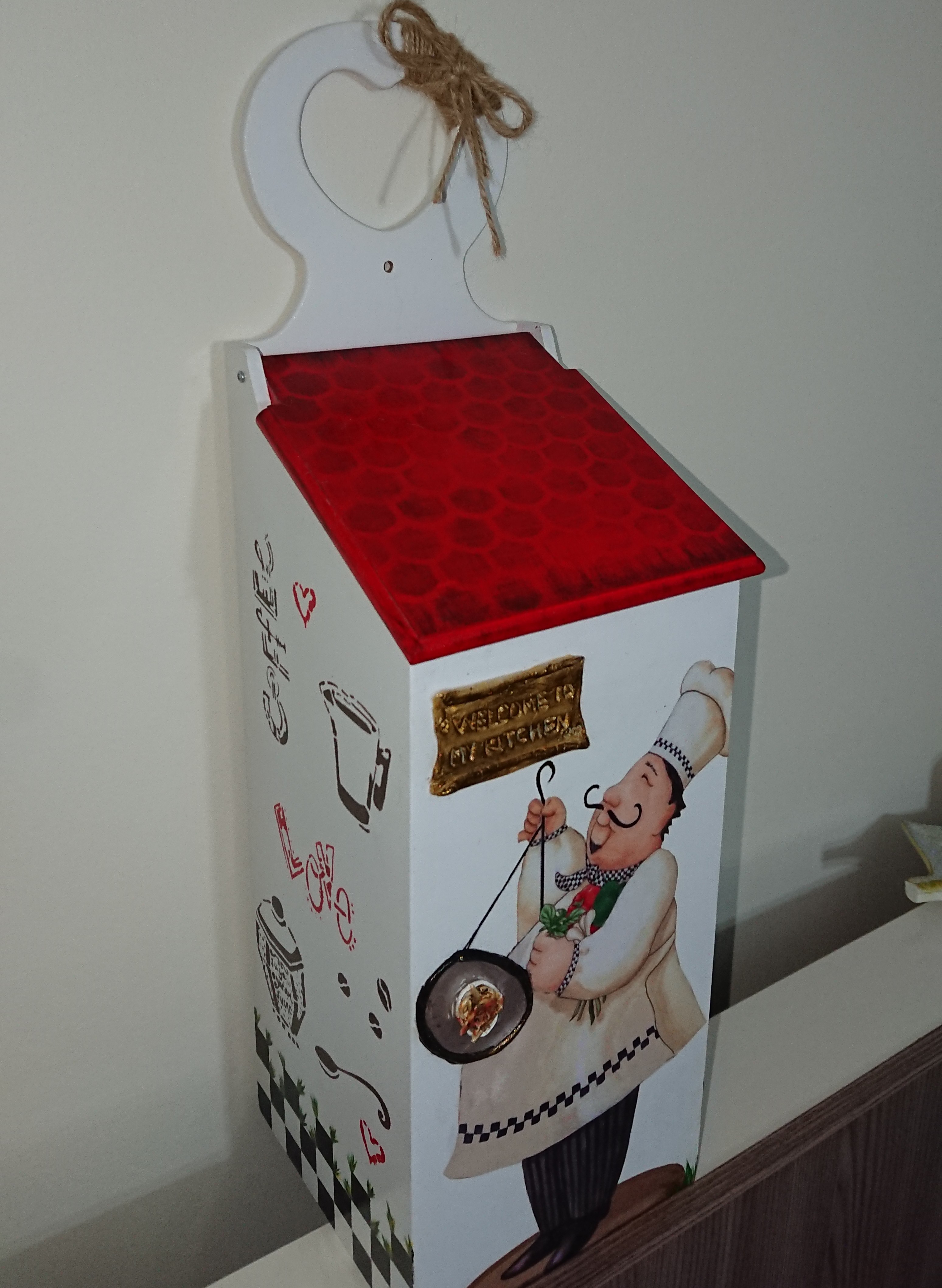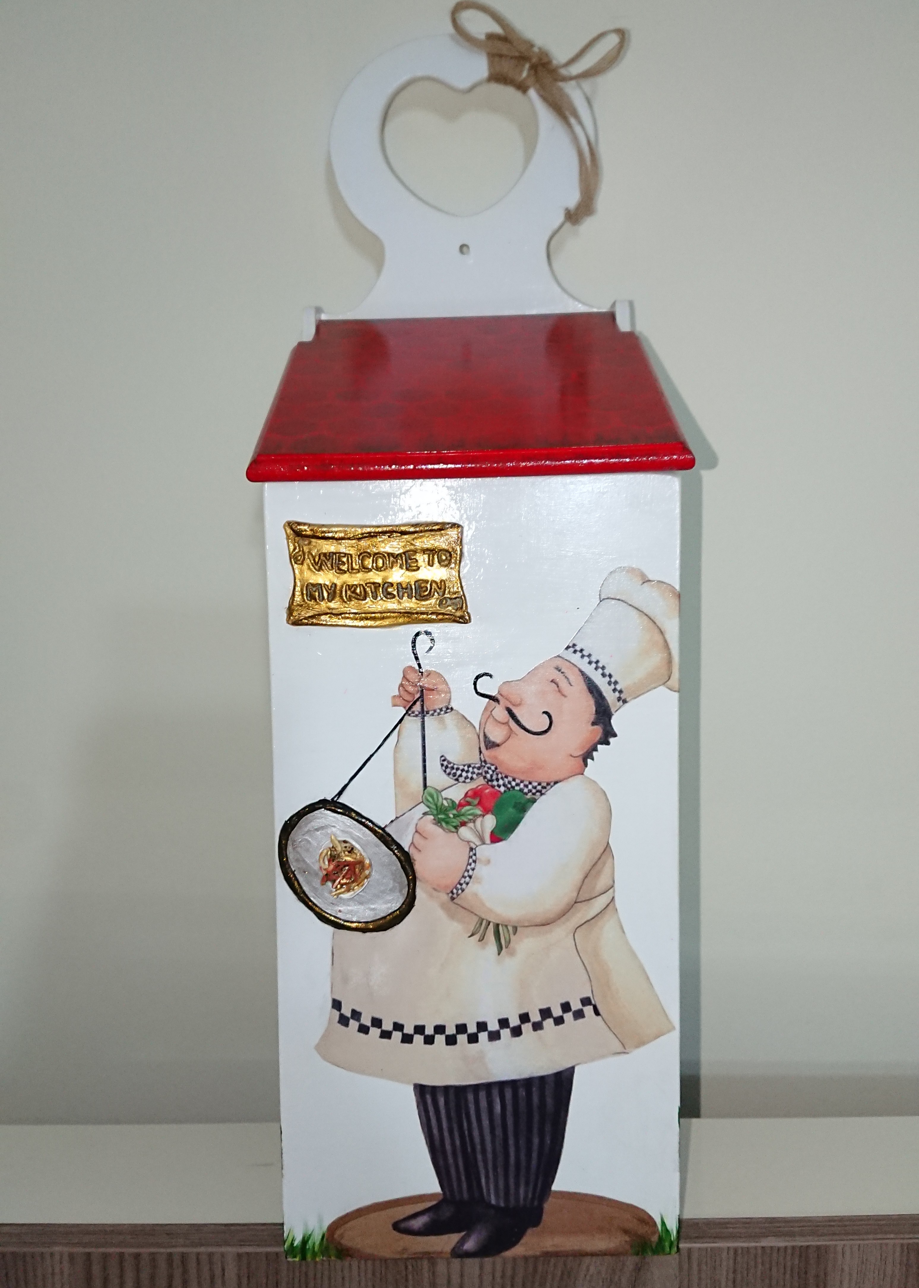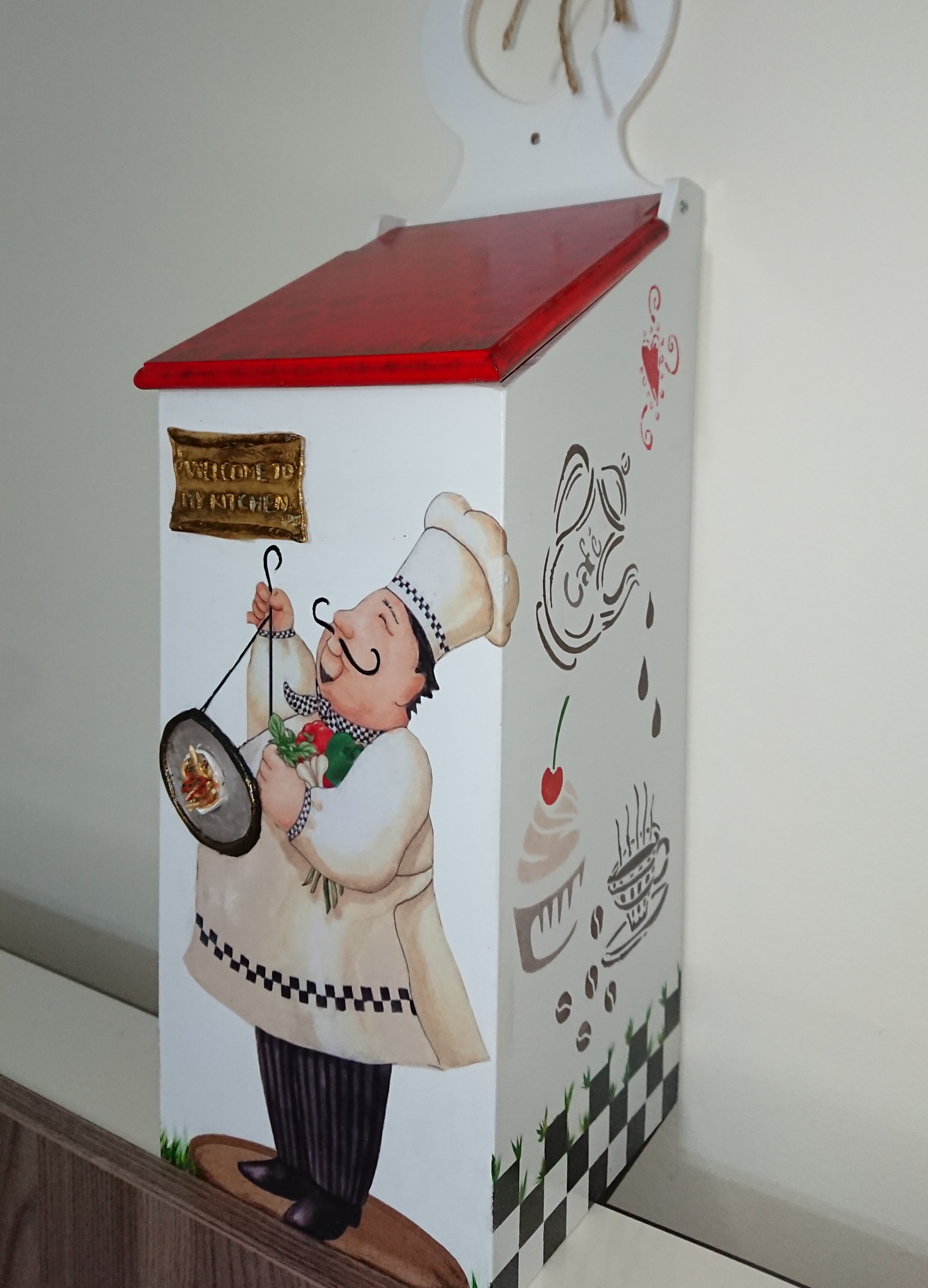 Detaylardan bahsetmek gerekirse ön yüzündeki aşçı adam dekopaj fakat karnından bir kısmı kesilmek zorunda olduğu için boyama ile tamamladım o elindeki tepsimiz yoktu, tepsi çizerek içine hamurdan makarnalar yaparak tamamladım. Ki makarna da ketçap, nane, pulbiber bile var. 😂