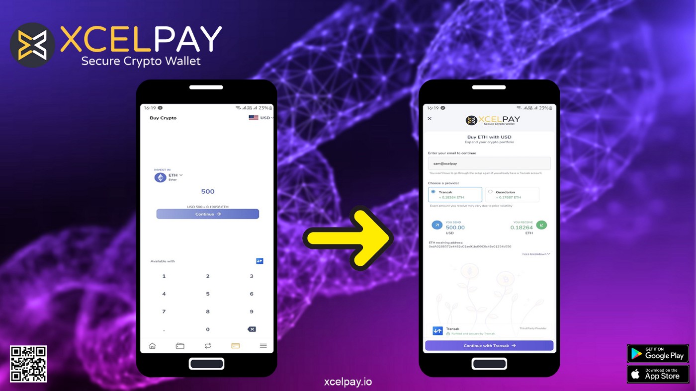 XcelPay Wallet has collaborated with Transak, a registered crypto asset firm with the UK Financial Conduct Authority (FRN: 928910). It supports all major blockchains and more than 100 countries and territories so you can easily buy the crypto of your liking from anywhere, everytime.Read more (https://medium.com/xcellab-magazine/buy-cryptos-with-card-on-xcelpay-wallet-3f5dbc2a8024).