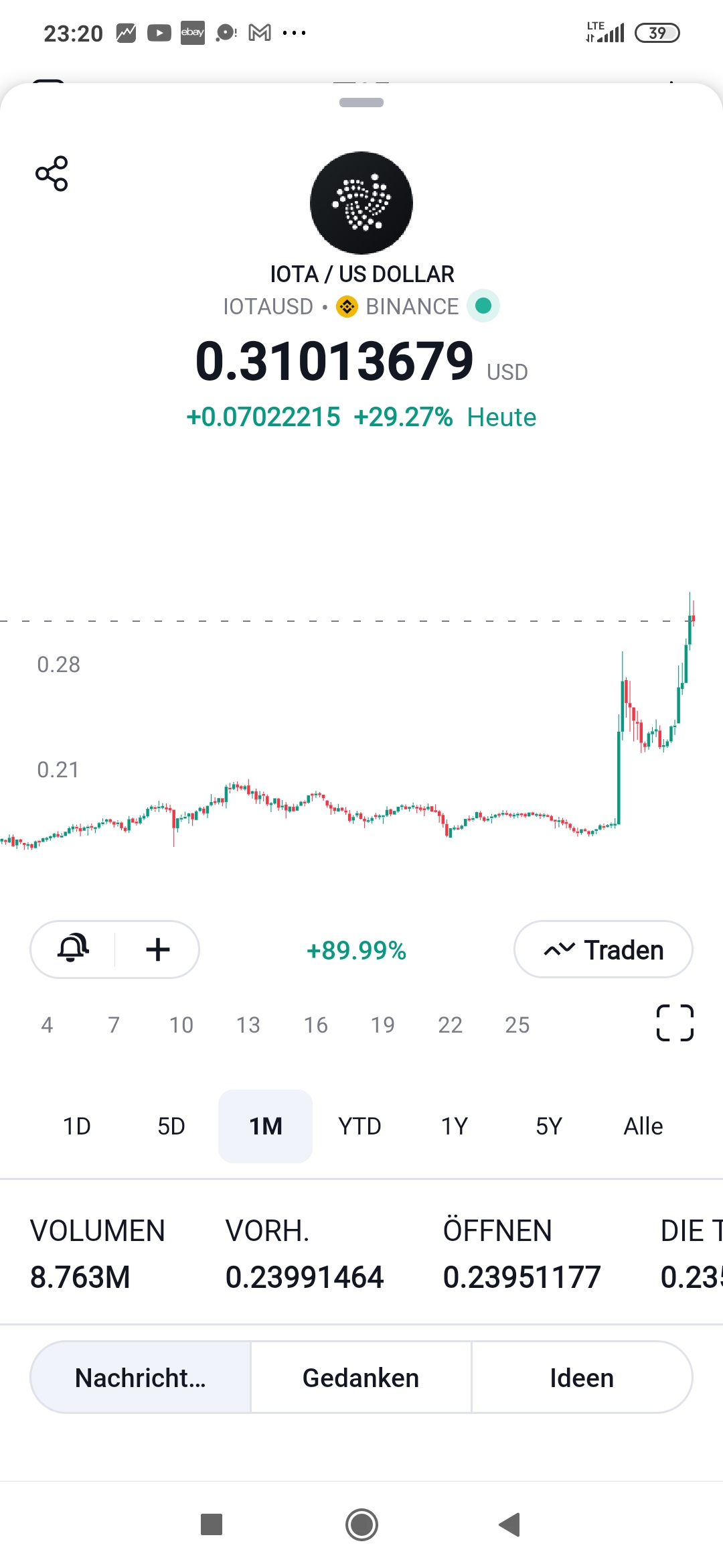 Hoppla, das nenn ich mal ne schöne grüne Kerze. Weiß nicht warum, aber IOTA sehe ich so knapp unter 1$, vermutlich weil der Kurs sich in dem Bereich einige Zeit bewegt hat.