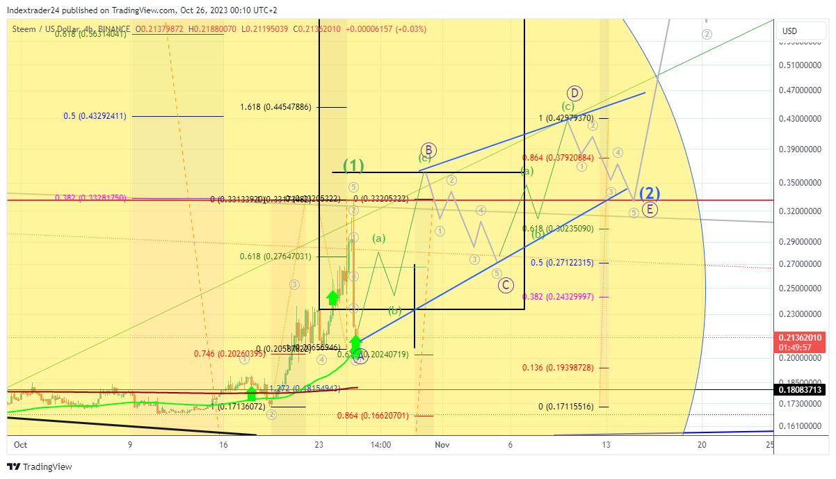 Für die Leerverkäufer ergeben sich damit erhebliche Verlustrisiken auf den aktuellen Kursniveaus, da die Bullen in diesem Fall den Abverkauf nach der 61.8% Korrektur sehr wahrscheinlich kaufen werden und damit die Leerverkäufer wieder aus ihren Positionen drängen werden. Das dabei favorisierte Szenario ist eine dreiwellige abc Struktur mit steigenden Hochs und steigenden Tiefs, welche ein Welle B Hoch über den Monatshoch von gestern bereits in den kommenden Tagen bzw. Anfang November wahrscheinlich ausbilden wird. Erst nach einem neuen Verlaufshoch werden die Shortseller, sofern sie smart genug sind vermutlich versuchen erneut gegen zu halten, was die Bullen aber wenig später im Welle c Tief sofort wieder kontern werden um danach ein neues Mehrwochenhoch in Form einer Welle D up auszuformen, ehe die Bären mit einem letzten Versuch eine steigende Welle e fabrizieren, die danach einen massiven Aufwärtsimpuls im Steem im Rahmen eines zeitversetzt einsetzenden Trending Impuls auslösen wird, welches durch dann erfolgenden Shorteindeckungen der gegenwärtig auf fallende Kurse setzenden Marktteilnehmer den weitere Anstieg des Steems befeuern und vermutlich dann auf neue Mehrjahreshoch katapultieren kann.