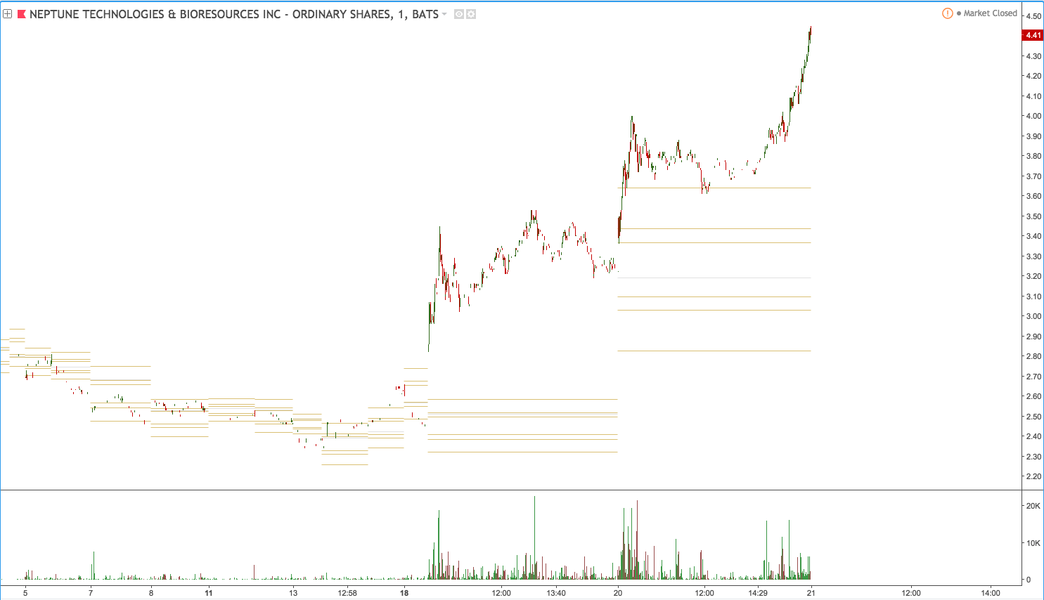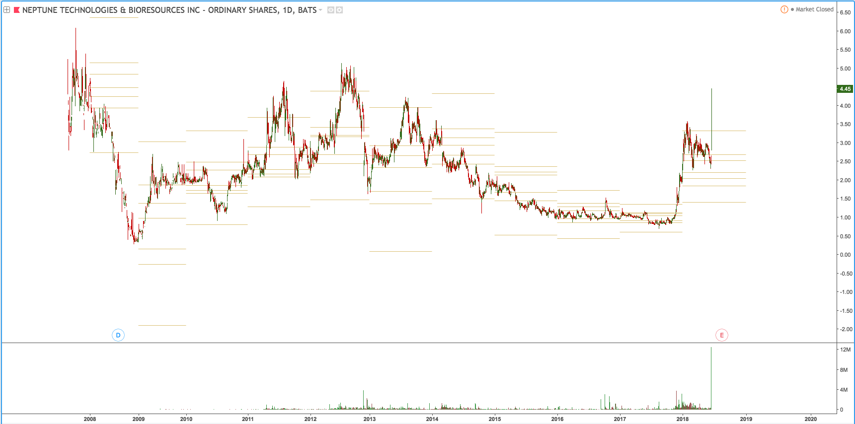When you look at the long term price history of NEPT you can see there was a top around $5.00 back in 2012. It's going to interesting to see how NEPT will react tomorrow as it approaches tomorrow. If this news is really meaningful to market we might even see NEPT break $5.00 and head upwards to $6.00 beyond.