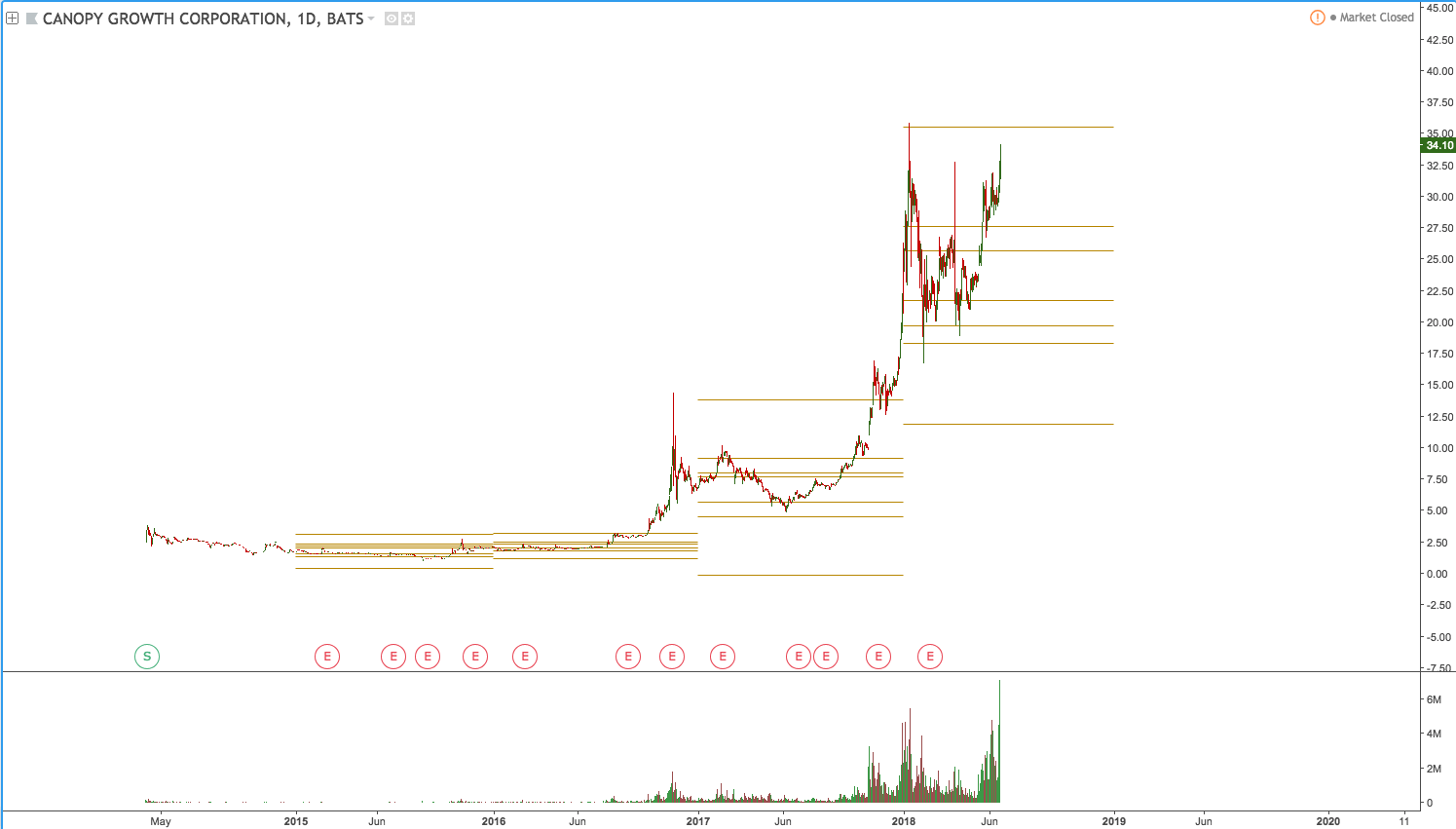 You can see the huge breakout in 2016 then CGC respecting for the Key Points from there on. The beginning of 2017 swung from the 2nd resistance to the 1st support mid year then had a nice breakout to the 3rd resistance. After retracing back down to the 3rd resistance as support it sky rocketed into January of 2018 at $3 7.50. It topped at this 3rd resistance perfectly and mind you that the level was made before the year begun. Then CGC bounced perfectly off of the 2nd support and the KEY POINT itself to trend back up to where it is now. It looks like CGC is ready for a nice all time high breakout (my favorite) above $37.50. So it is something I will be looking at long term with a handful of Marijuana stocks.