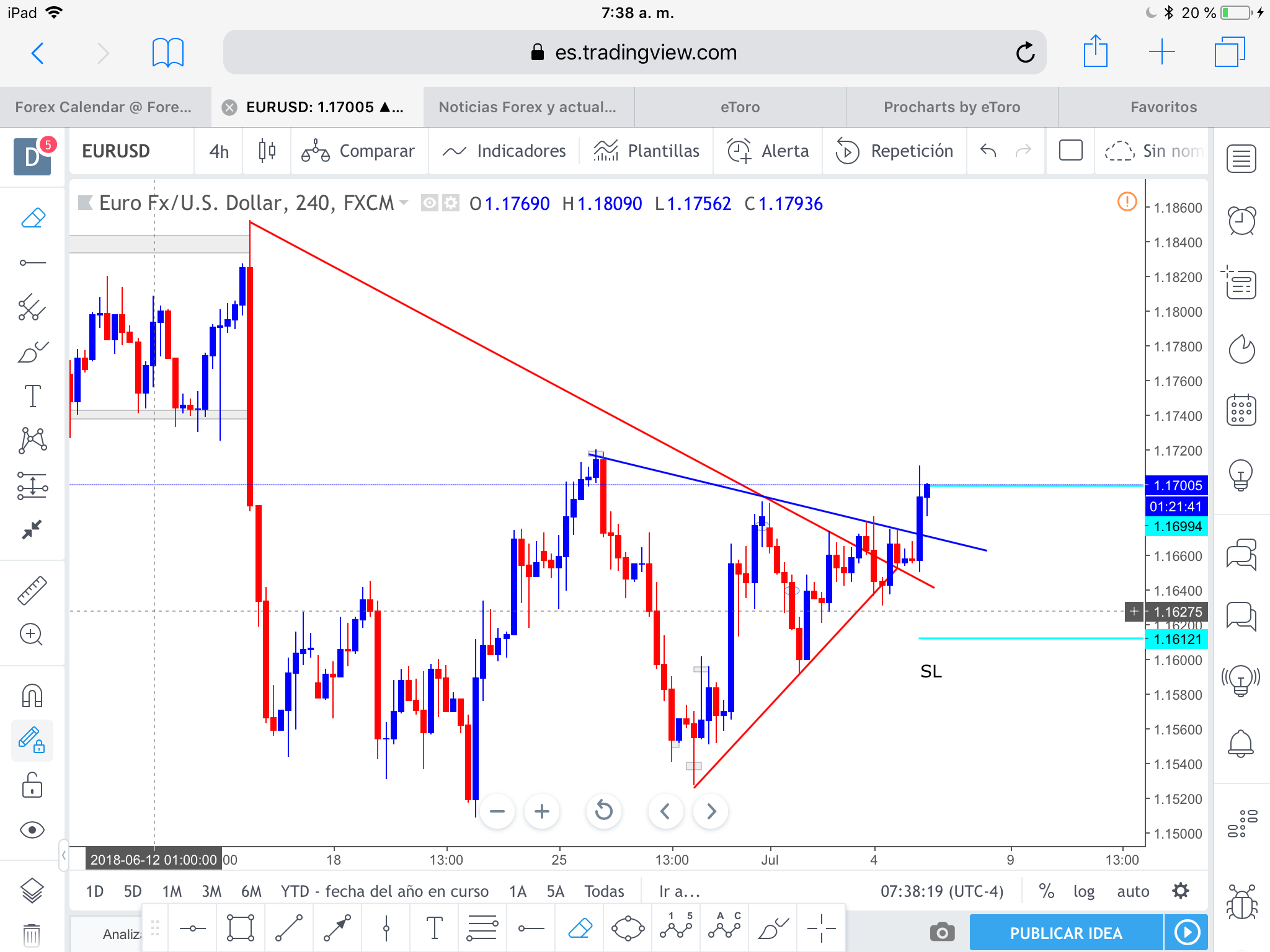EURUSD análisisdouglasbp (26)in #trading • 8 years ago Patrón de triángulo de continuidad de tendencia que se cumple. Para hoy se esperan noticias fuertes para este par de divisas. Esperar dos horas después de la noticia, entrar si las condiciones están dadas.