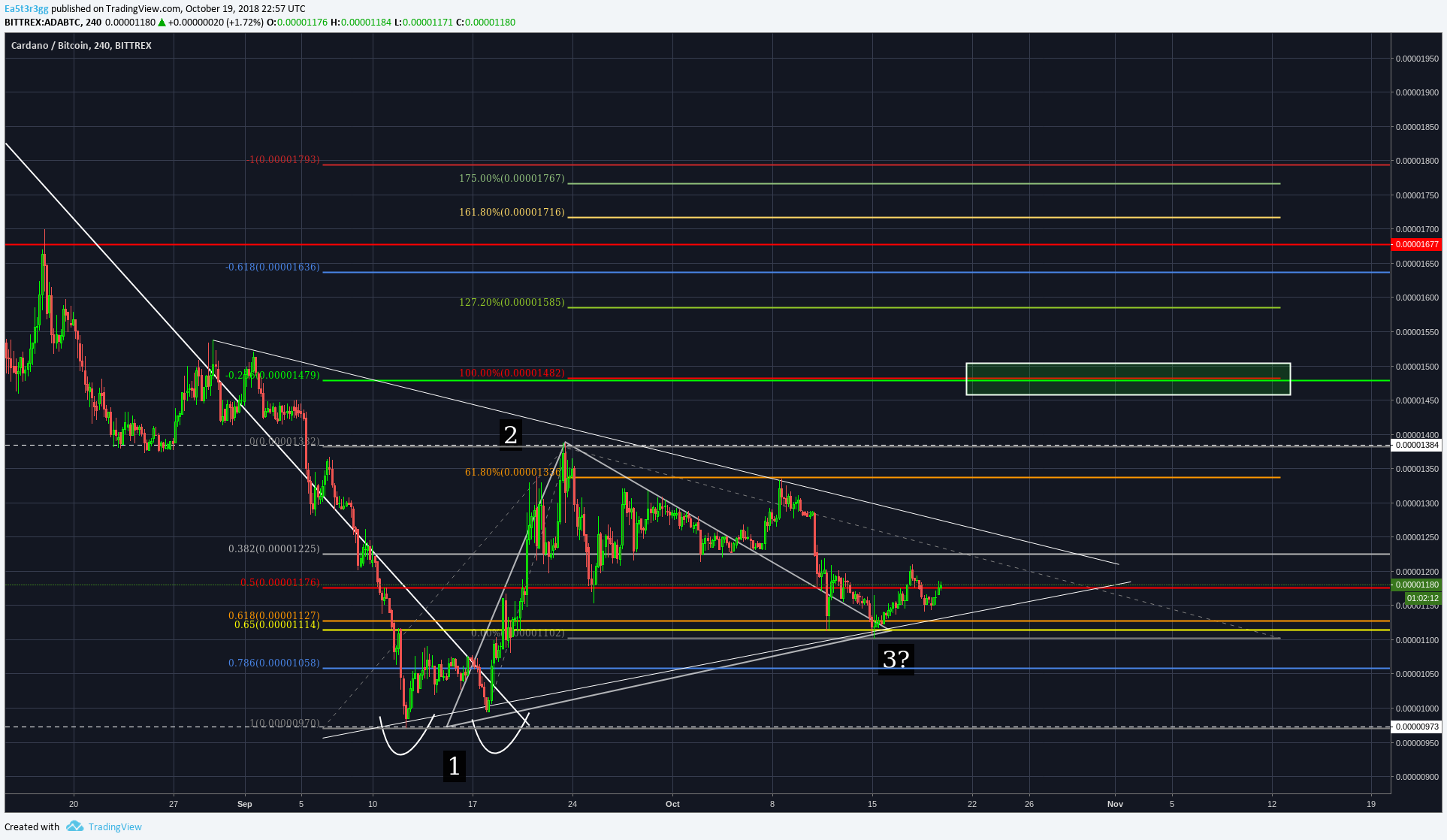 We have a potential 123 bottom on ADA to Bitcoin. Short term target are at usual algo targets marked by confluence the fib pull and the APP. If this is a reversal then we could expect more upside in the short term.