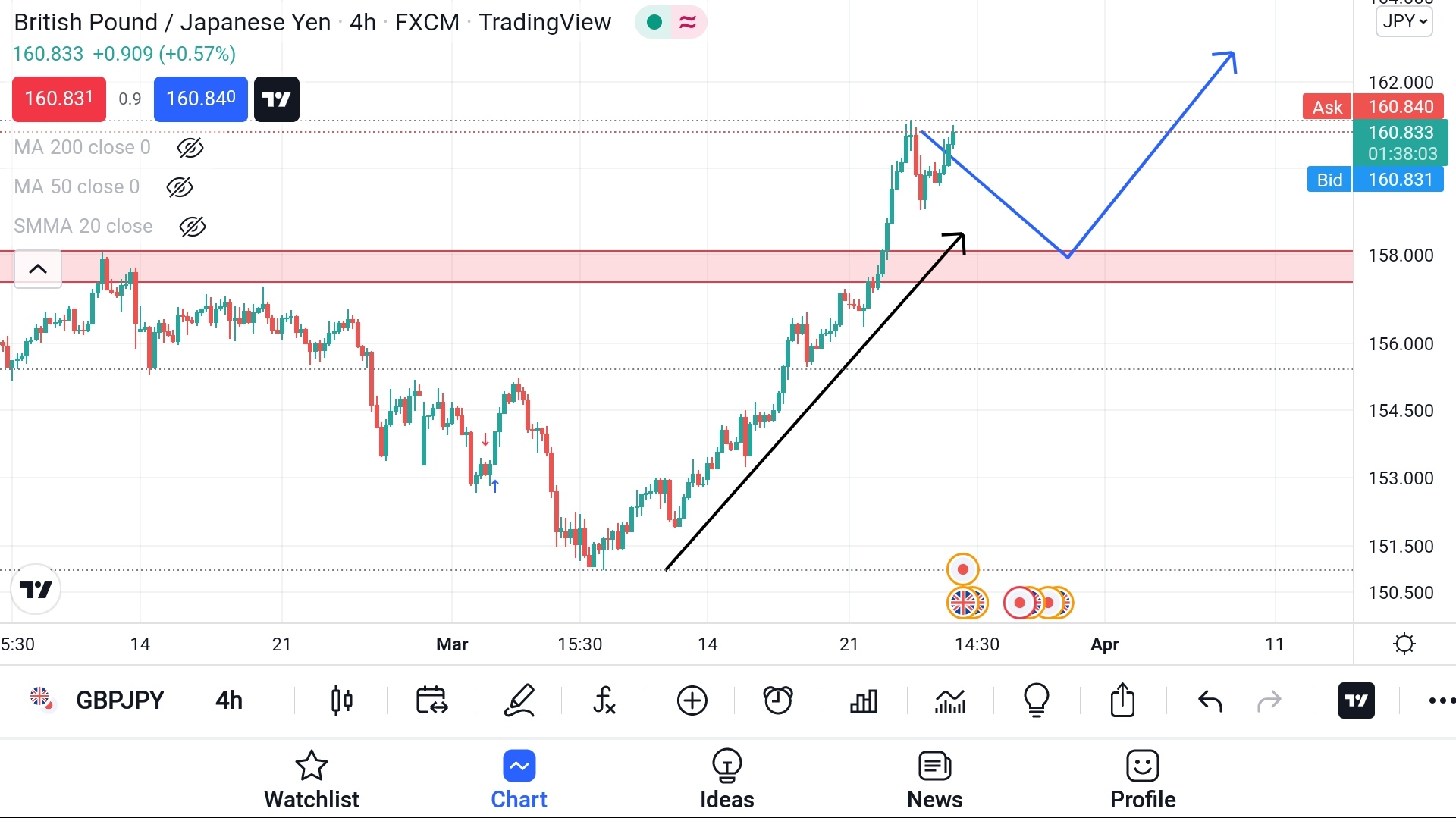 GBPJPY. Similar scenario like EURJPY. So, I have got the similar setup - breakout pullback. Once price comes down to test the broken resistance level 158.000, I am there to take BUY trade and expect the market will continue to go upper direction as I have shown by arrowing.