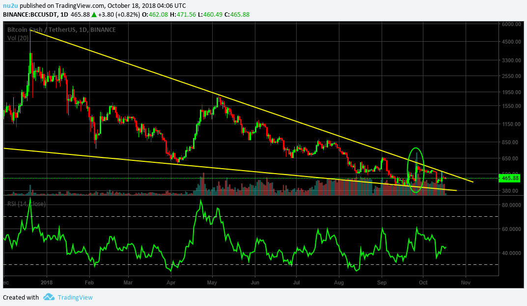 Since reaching its all time high of $5389.35 on Binance (the #1 cryptocurrency exchange by trade volume), Bitcoin Cash has been in and 11 month bearish down trend losing as much as 75% of its value. But that may be nearing it's end. Having reached a low of $408 on Sept 19th, BCH had its 2 largest volume trading days since it's been listed on Binance. As the daily chart below show, BCH lower highs have been greater than the lower lows resulting in a Falling Wedge which is a bullish pattern. A positive divergence is also present between the RSI and the price line. With Bitcoin futures expiring in 2 days we could still see a short squeeze which could propel BCH and other altcoins higher.