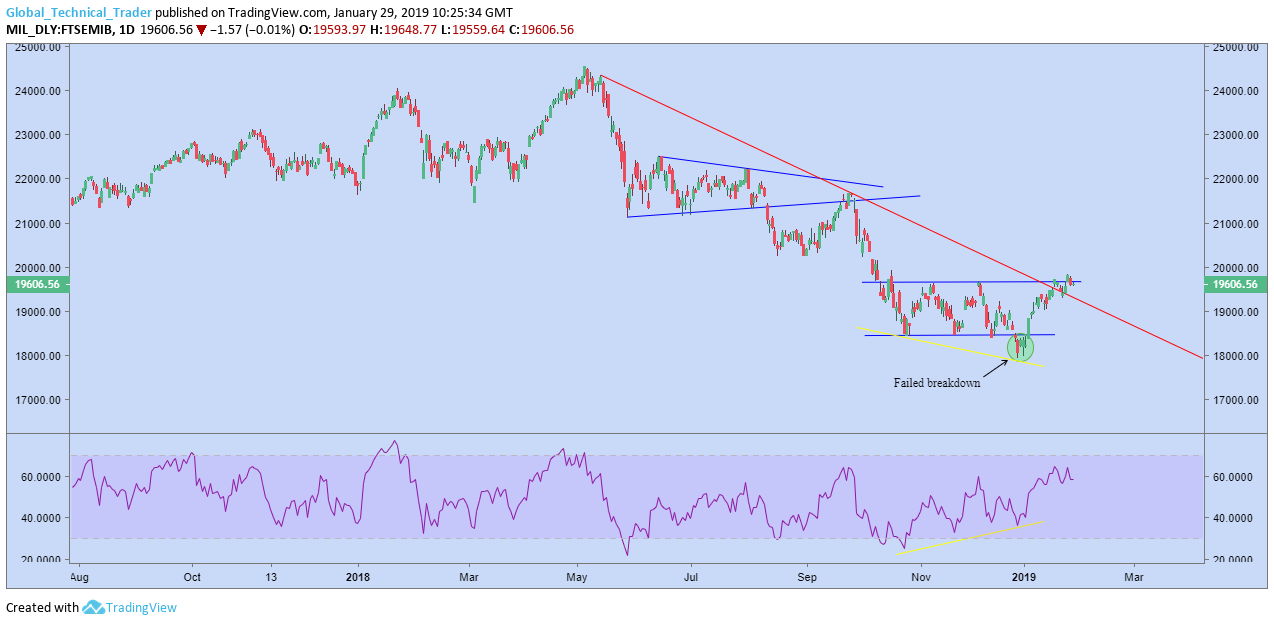 Italy has broken it's downtrend and sports a failed breakdown and bullish divergence.