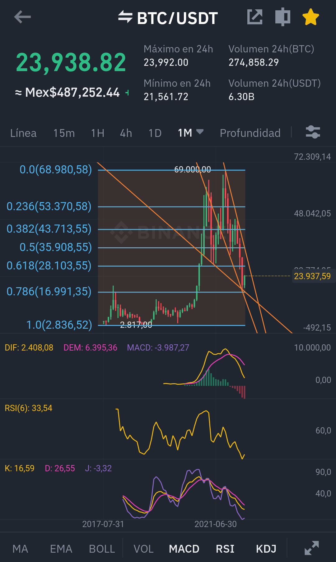 El día de hoy haremos un pequeño análisis de bitcoin, para mí análisis utilice la herramienta fibonacci desde los $2800 dólares a los $69000 dólares.