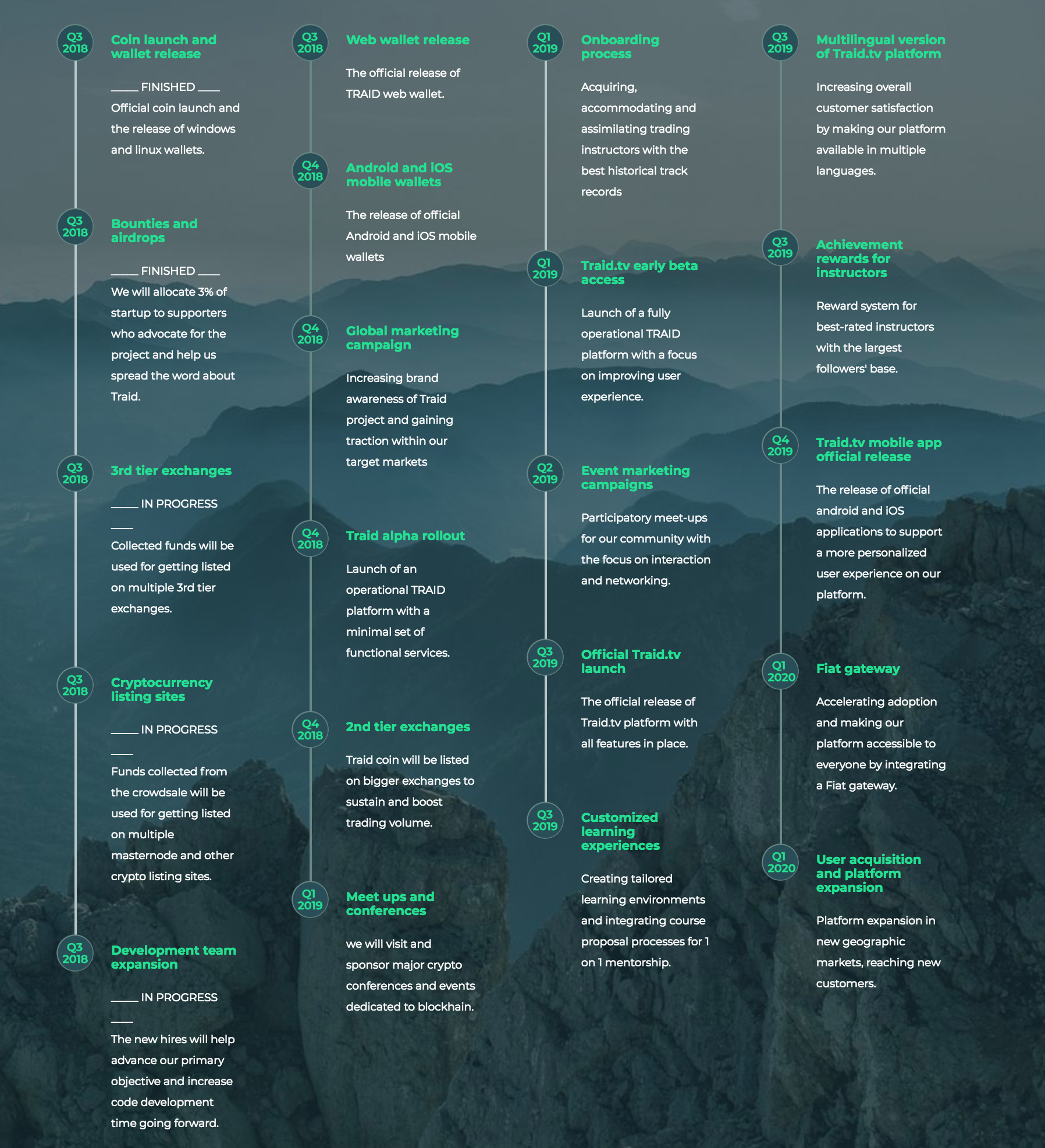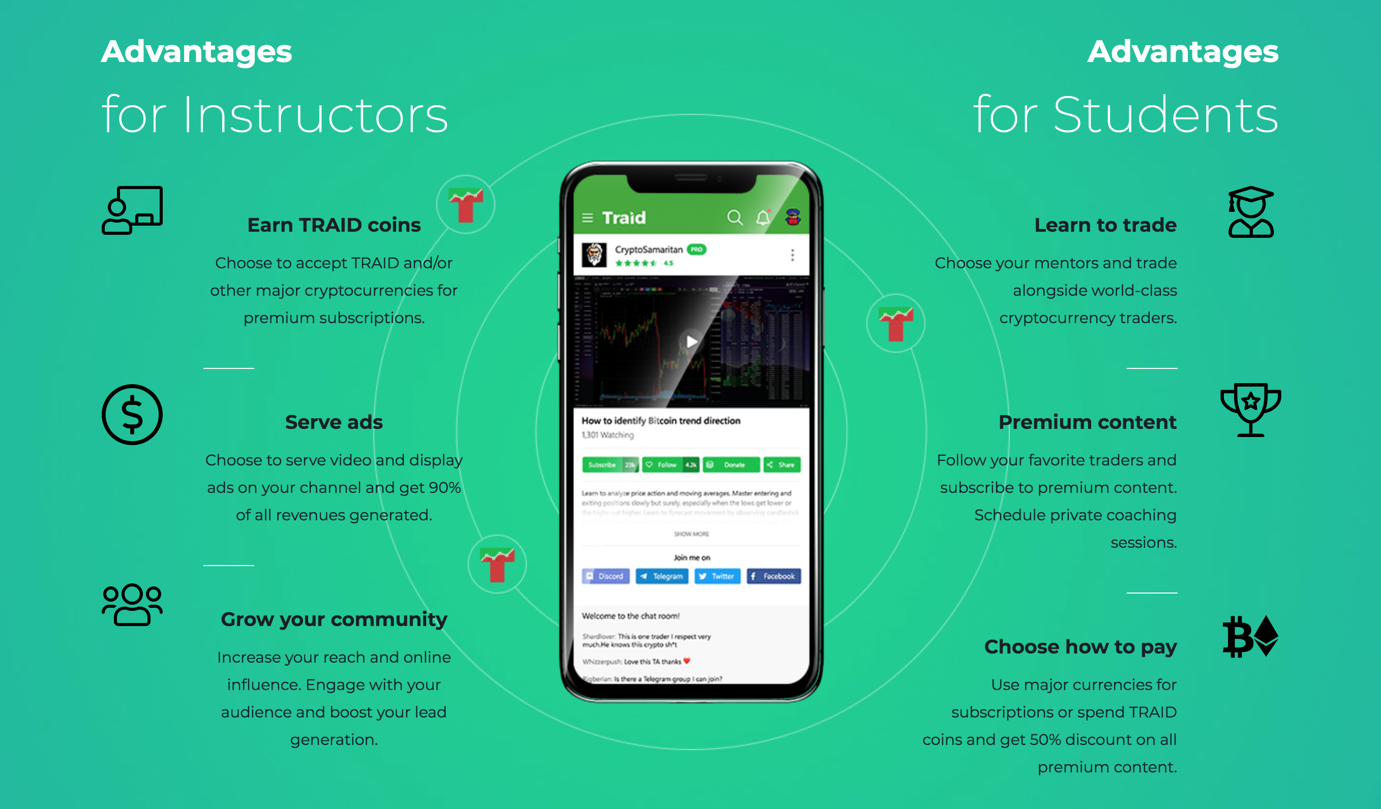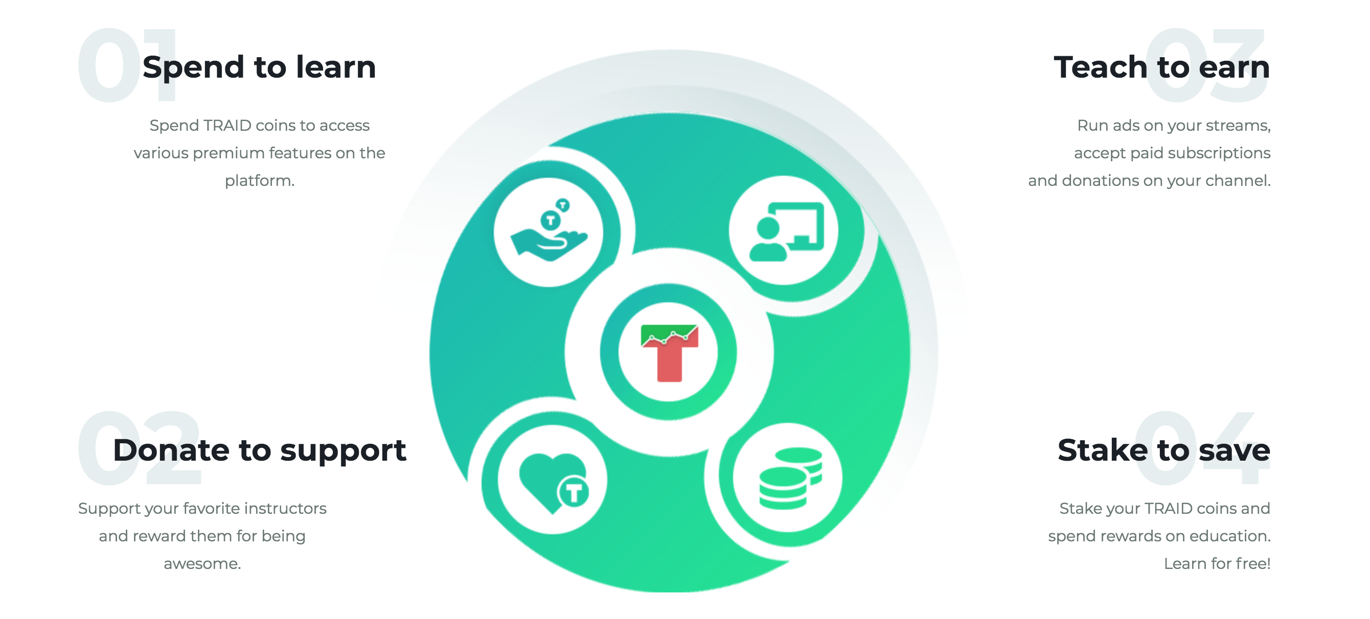 Traid project aims to deliver a live video education platform that is highly scalable, crypto incentivized and results in a solution which lets crypto enthusiasts discover investment ideas and get better at trading by seeing what the world's leading crypto traders are doing.