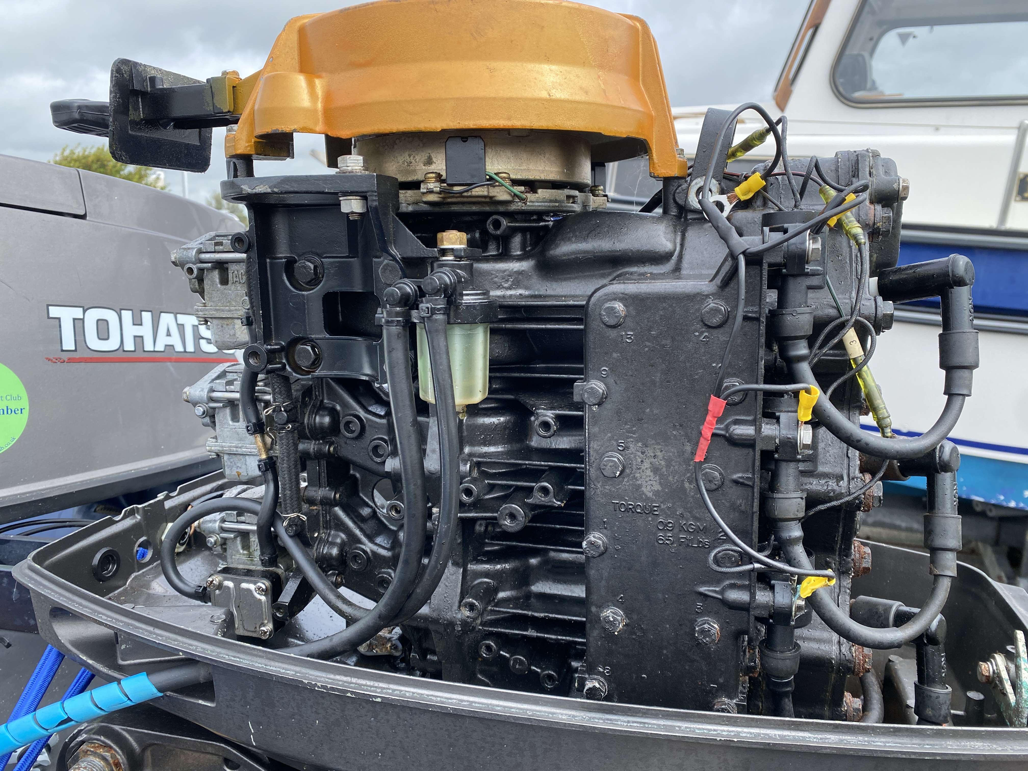 We race an Aquarius Aquacat with a Tohatsu 50hp 2-stroke motor.