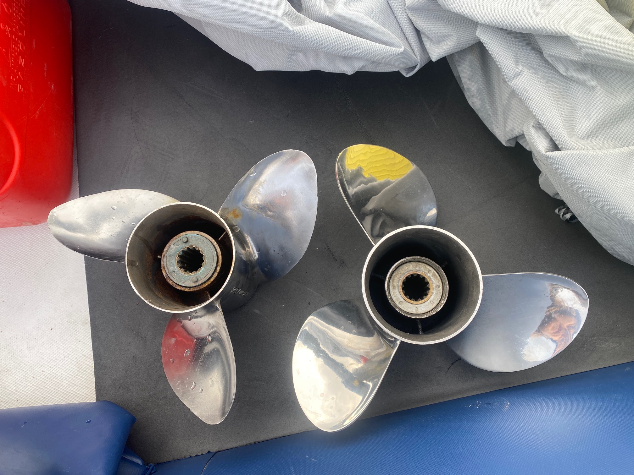 You can see the prop on the left has been worked as oppose to the same prop on the right. Prop on the left is a 14p and prop on right is 15p but you get the idea. Its around £250 to get the prop shaped, thinned and cupped ready for racing.