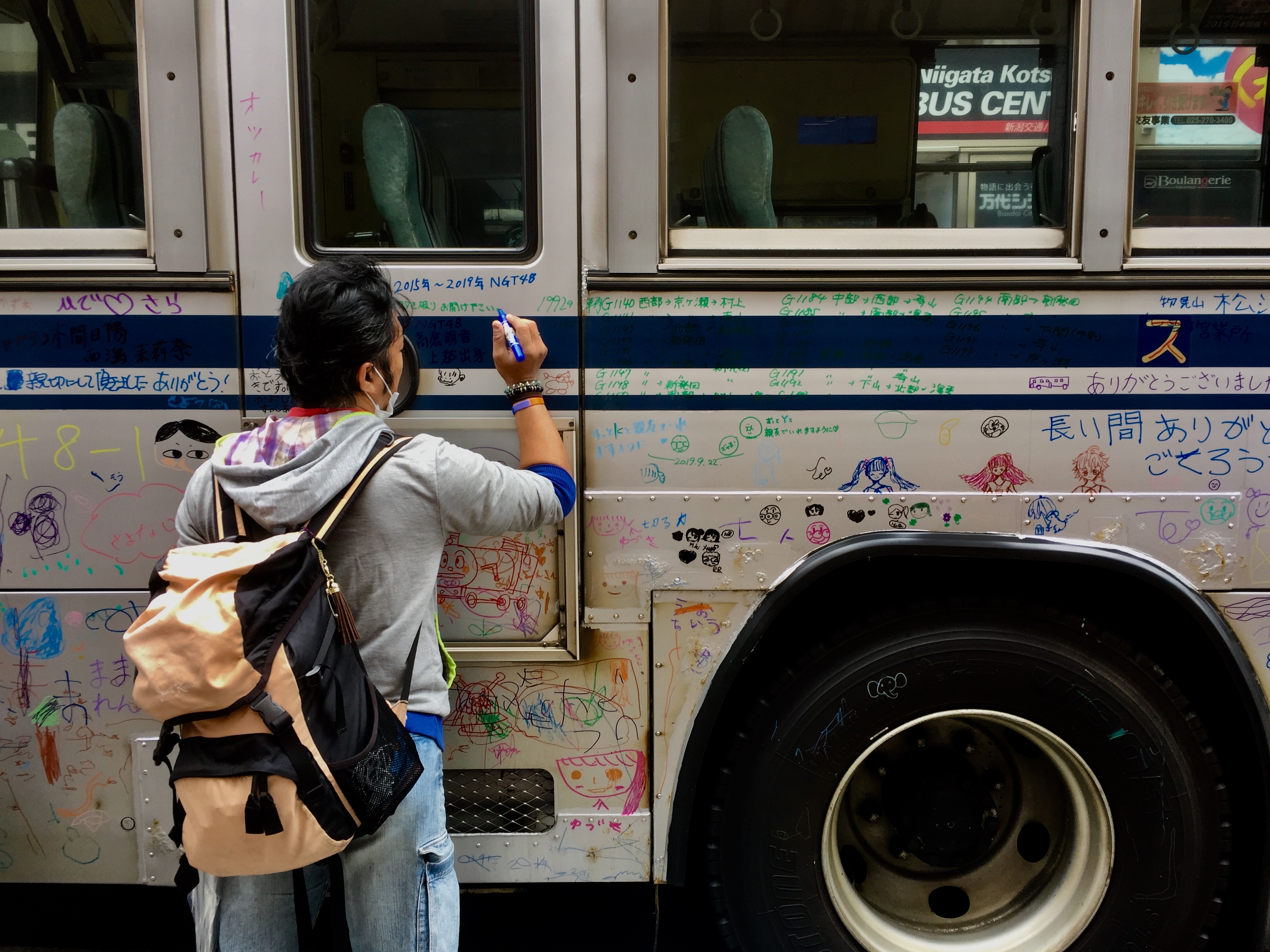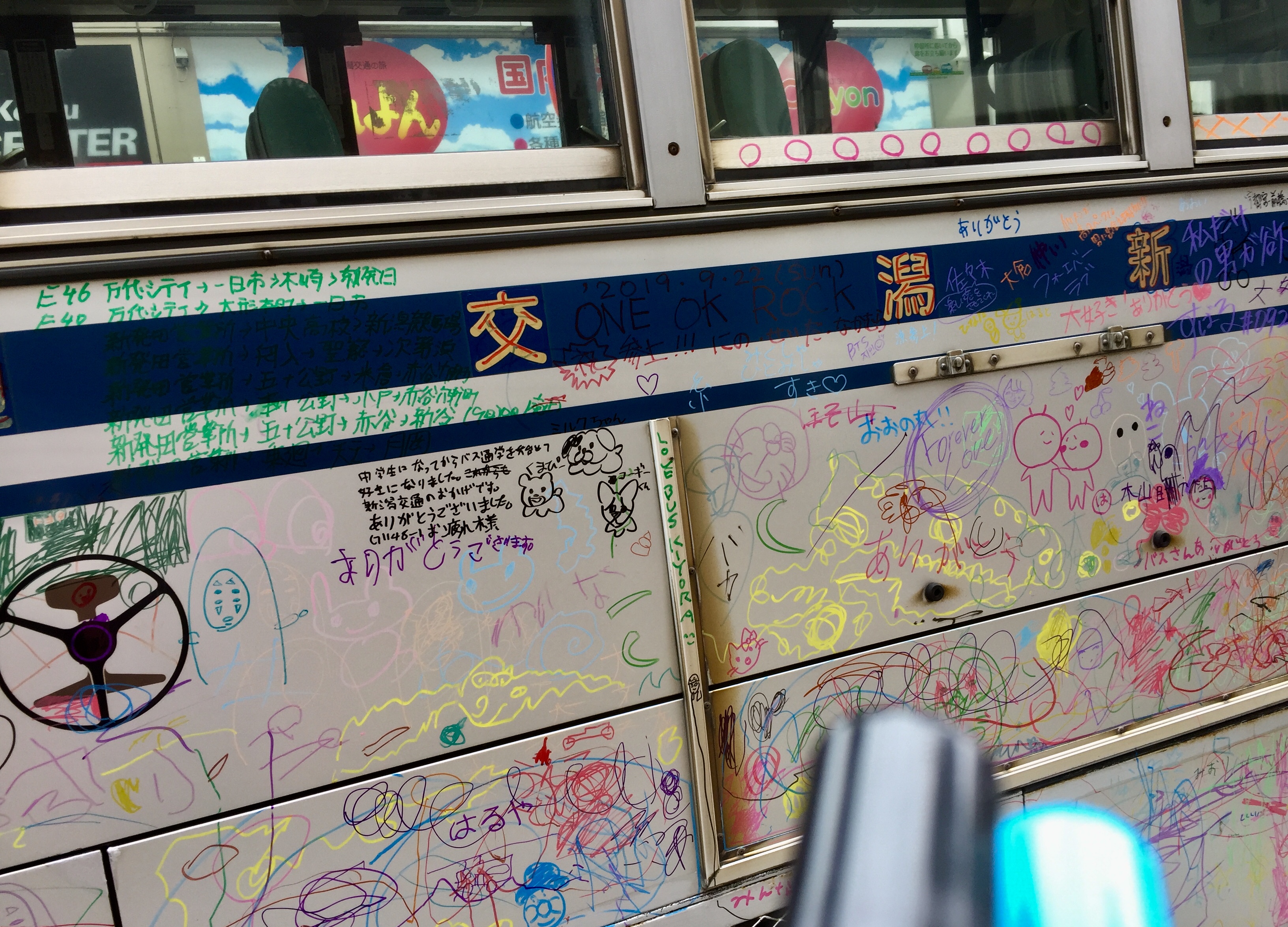 Looking at the Raku-Gaki Bus, many people here tend to say “Thank you”, and/or draw one their favorite characters. Do you see any characters that you recognize?
