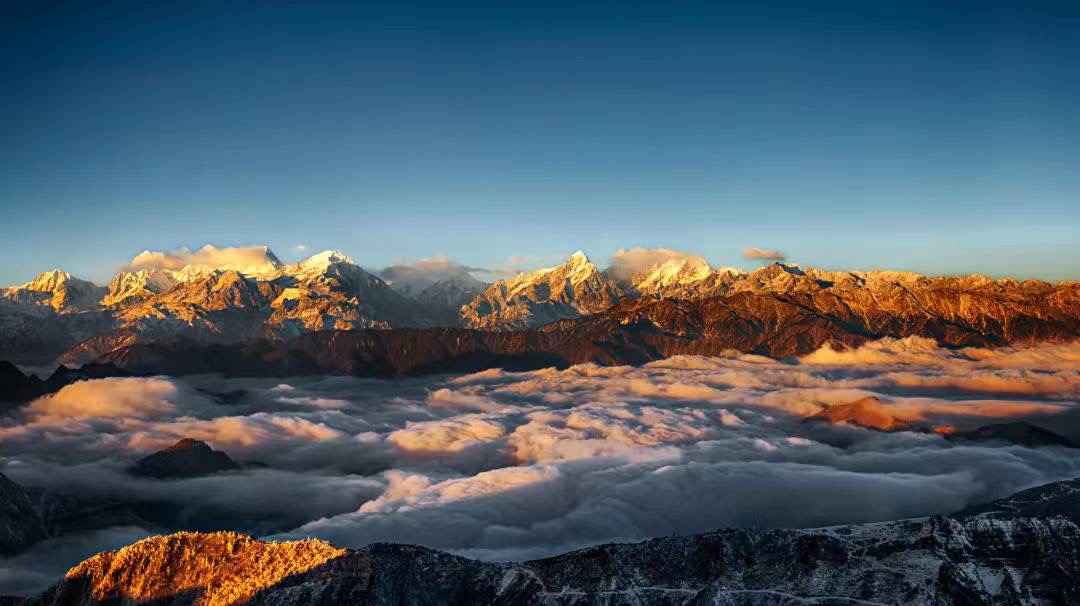 当你登上这里,可以看到,群峰起伏,贡嘎雪山银锷刺天,大小瓦屋山横卧于此。在这里可以看日出、赏晚霞,感受着这绝美的风景。