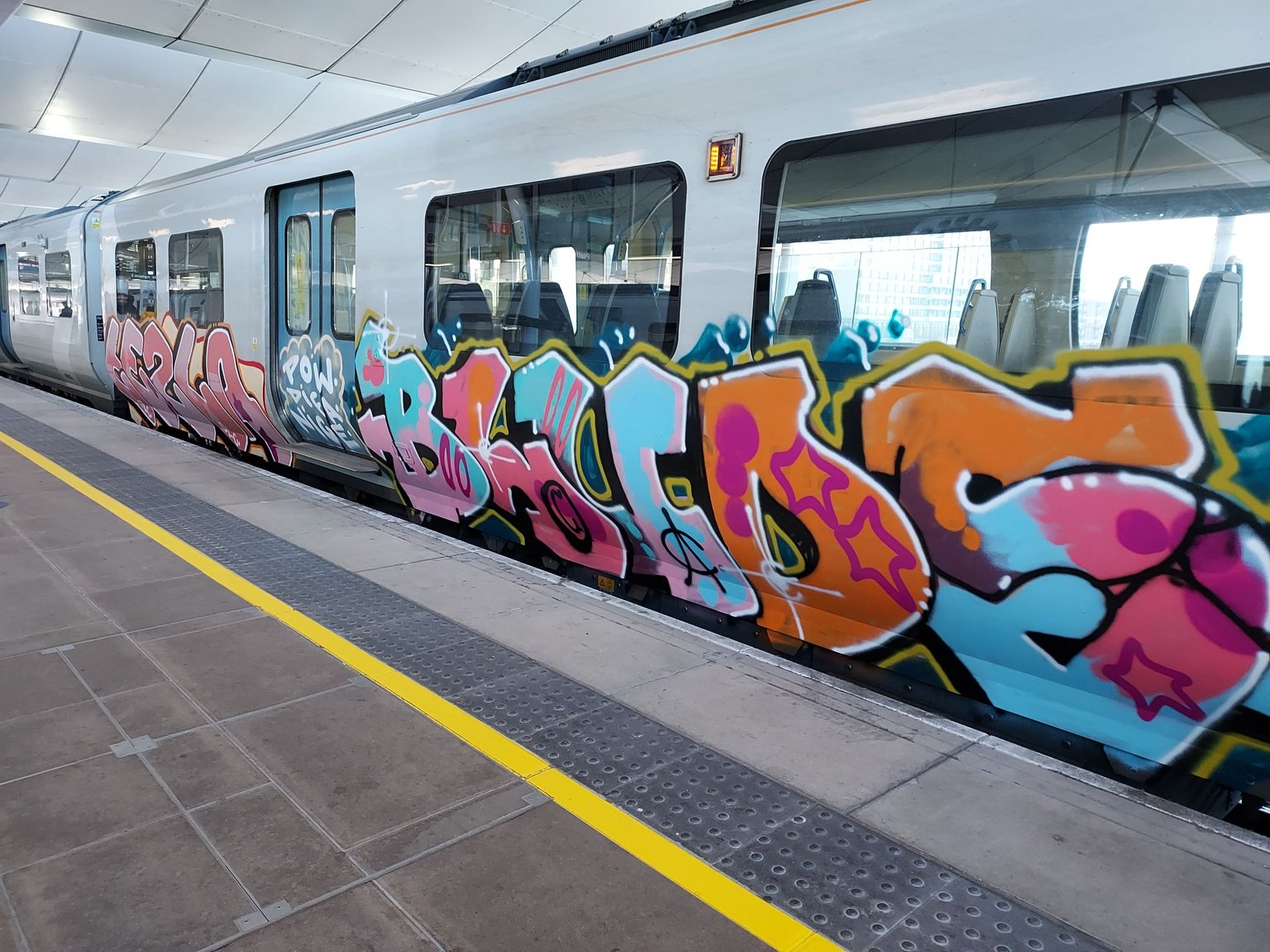 Last and not the least, I'm going t leave you with these two images. As I was walking along the length of the platform, a couple of the carriage had this graffiti on it. They look rather random and I don't think they're purposed made by the railway company.... or maybe they were. I really don't know. It's the first time I've seen graffiti on train carriages in use and they look wickedly cool, just like this station and how London evolves as a city.