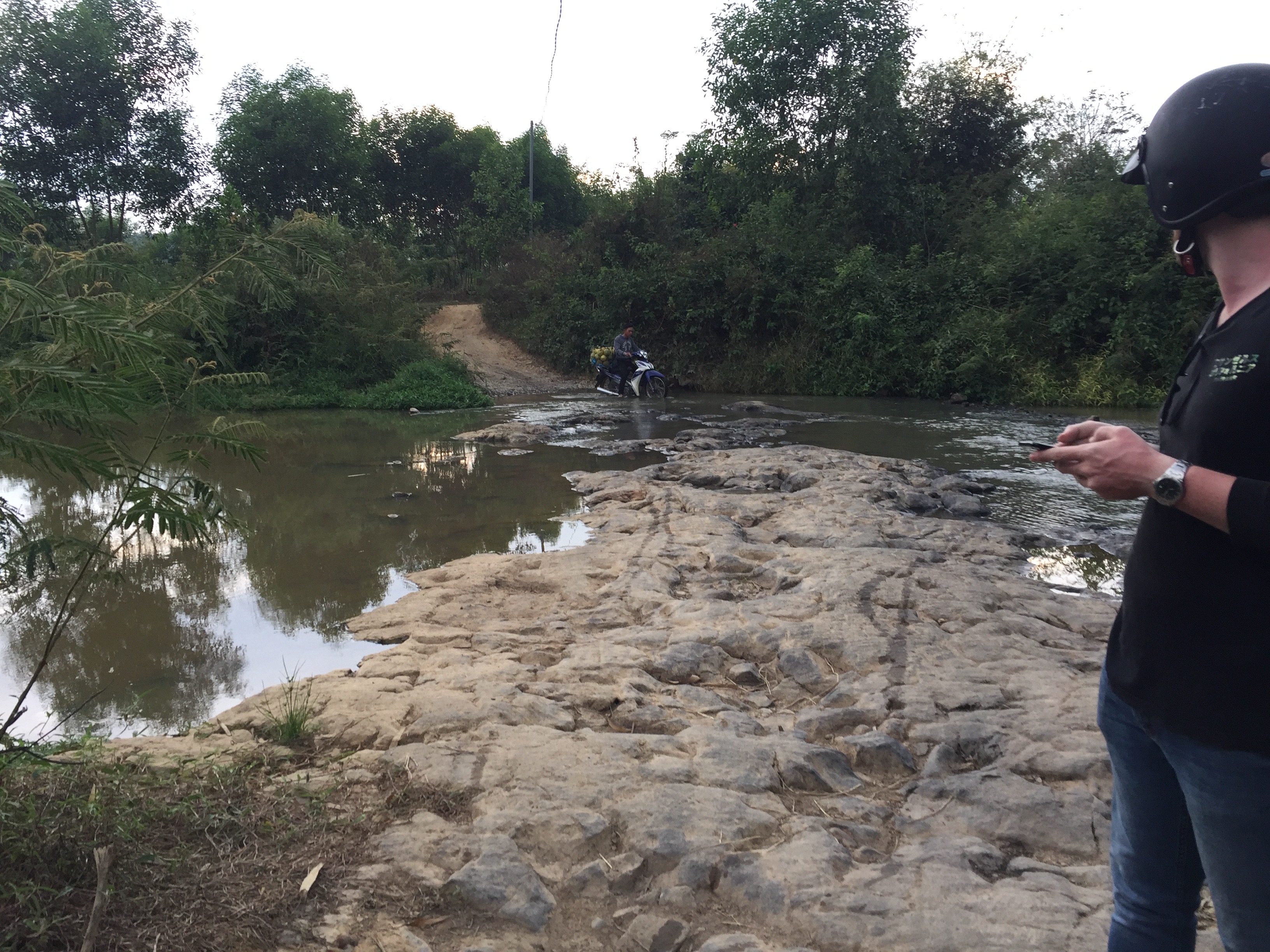 as we make our way through we stumble upon a riverbed and my map just says ….yeah it’s this way - both of us looked puzzled. - How we gonna get across without getting out engines completely soaked? - But as we are standing there, with question marks as a face, this Vietnamese guy on the other side with his bike, loaded with coconuts just looks at us and drives on. I bet he was thinking, “Man, these crazy foreigners can’t even do that.”