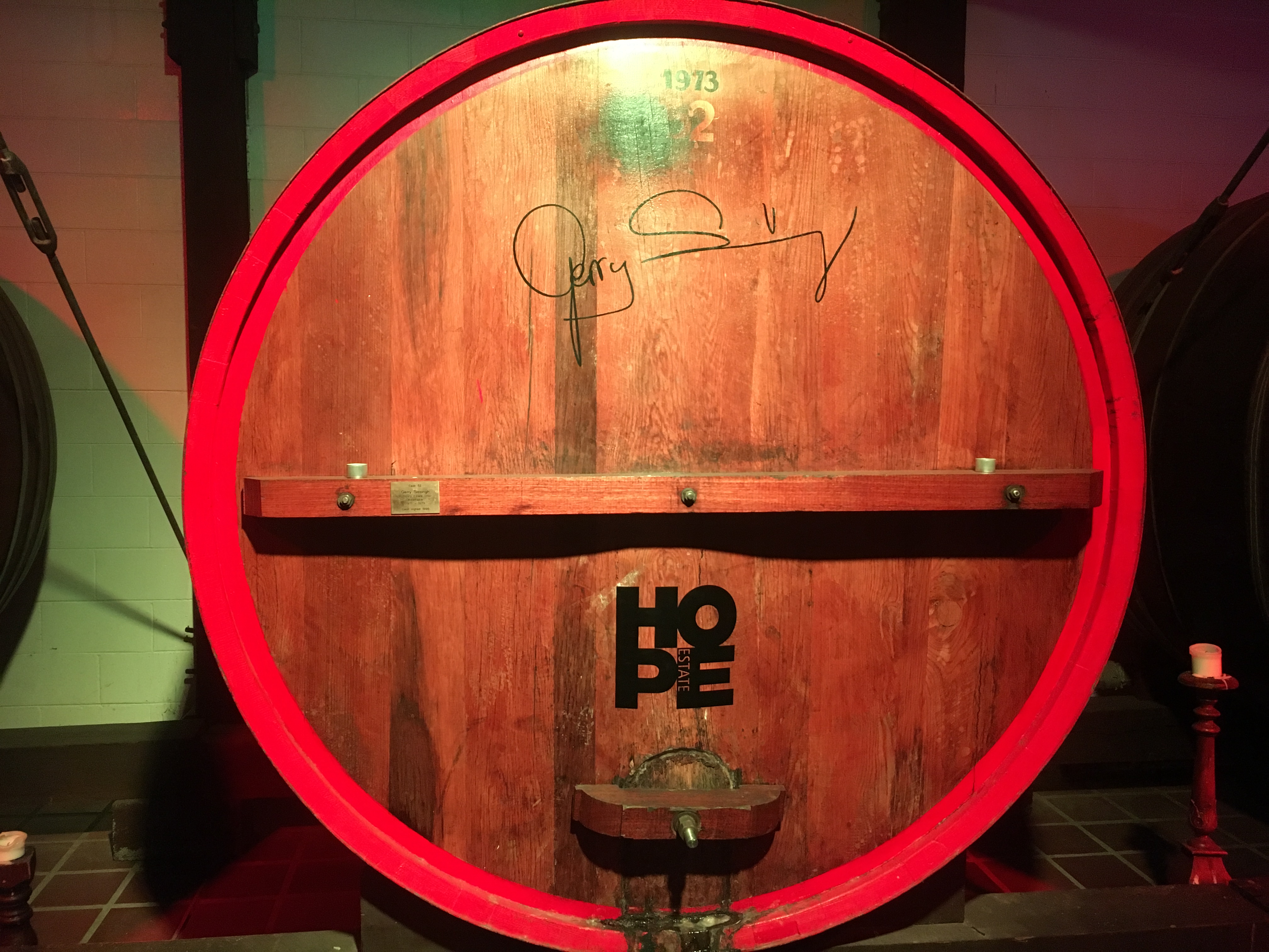 Our next stop was the Hope Estate Winery. This place is extra nice to visit because they have 59 enormous wine-filled casks lining the walls, signed by Hunter wine legends, notable figures and celebrities. Two of these are none other than Jerry Springer and John Lennon!
