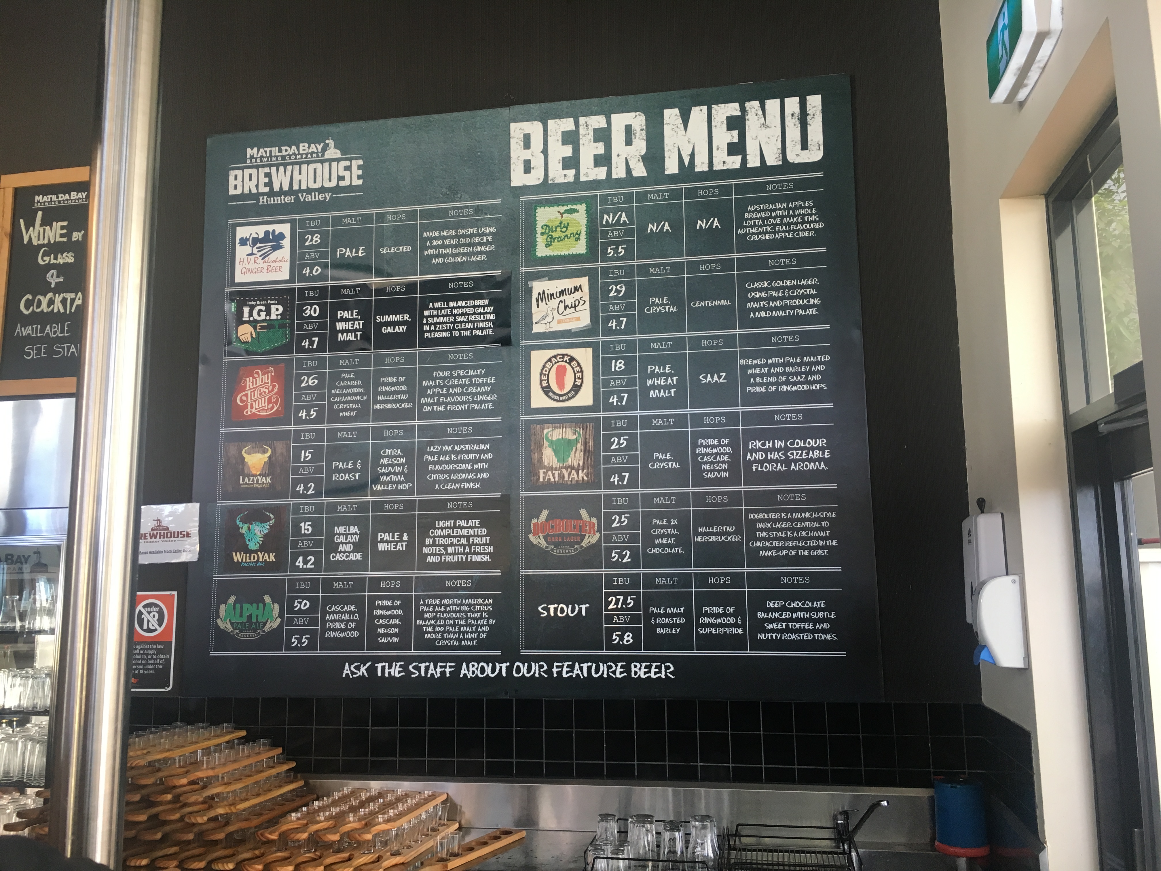 Our first stop was the Matilda Bay Brewhouse in Hunter Valley (NSW, Australia). Once our bus arrived we were able to choose the right or left side of the menu for our beer tasting. They gave us a sample of each of the beers in the side of the menu we picked and then gave us a full beer of our favorite after the sampling.