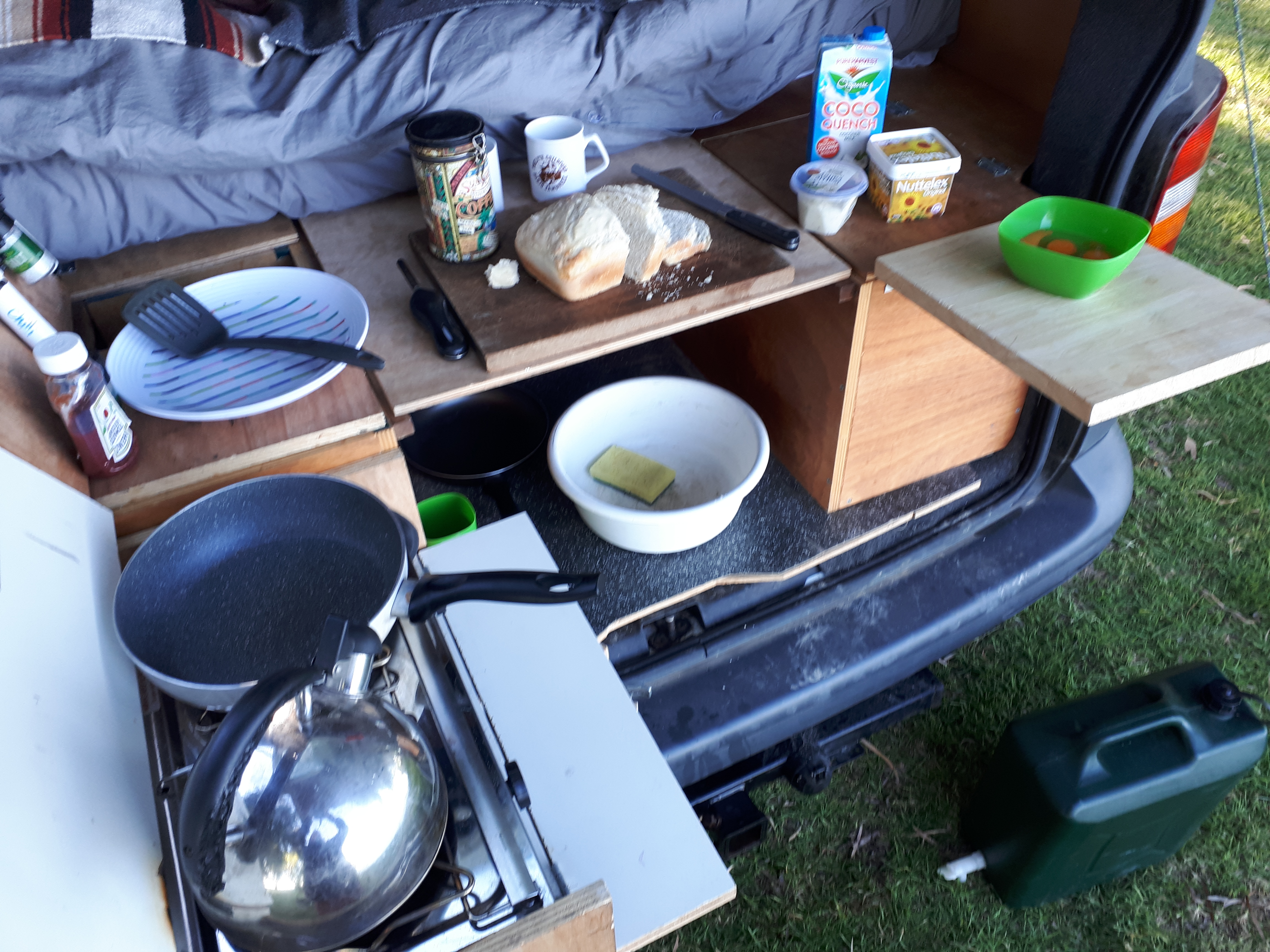 In the above photo you can see the 'transformer' version where we can attach to the back via a long bolt. This gives us much more bench space so I tend to set it up like this for dinner. It kinda blows me away how much cooking space it gives us - so much so that we rarely take down the table in the ski tube we keep on the roof (that also has chairs snorkels, wetsuits, the solar panel and so on).