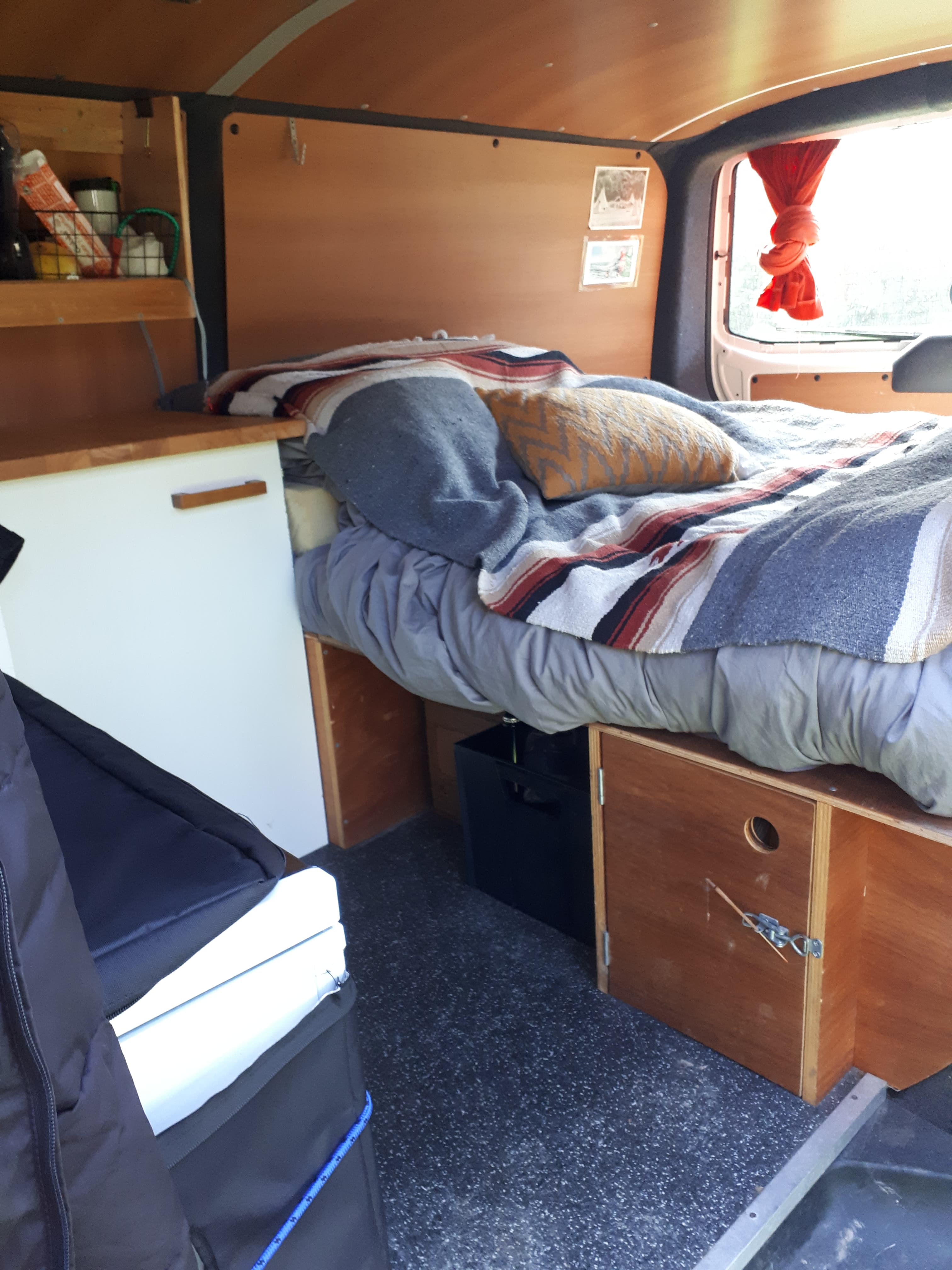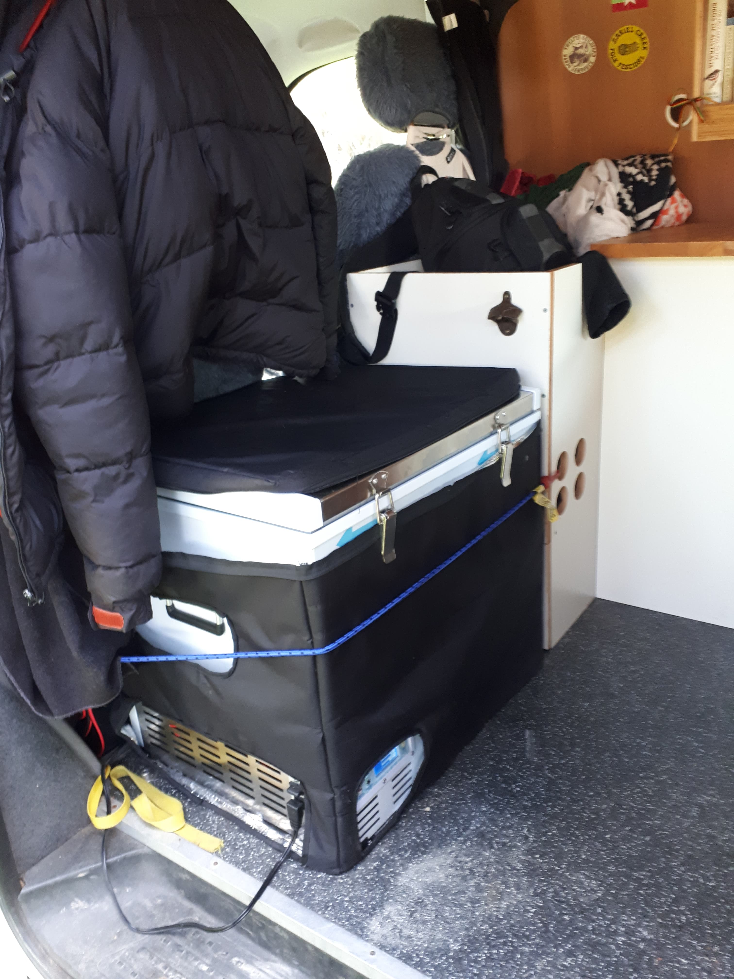 To the left of this is the space for our old Engel 12vo fridge, and under that, a sliding drawer that we used to fit J's clothes (mnd hang off the back of a passenger seat in a big overnight bag). However, the fridge broke, and our new fridge is heaps bigger as I wanted to be able to carry enough fresh food to last for at least a week, which the Engel couldnt do. So now our clothes all just get stuffed in the fridge receptacle and the space underneath we can't really access without pulling the fridge out. That's okay though as we put emergencey supplies in there and other camping equipment. I can fit at least a slab of beer under there, or a carton of coconut milk with room left over for plenty of other things. It kinda blows my mind how much stuff we can store in this van - far more than you'd expected. She is like the Tardis in that way.