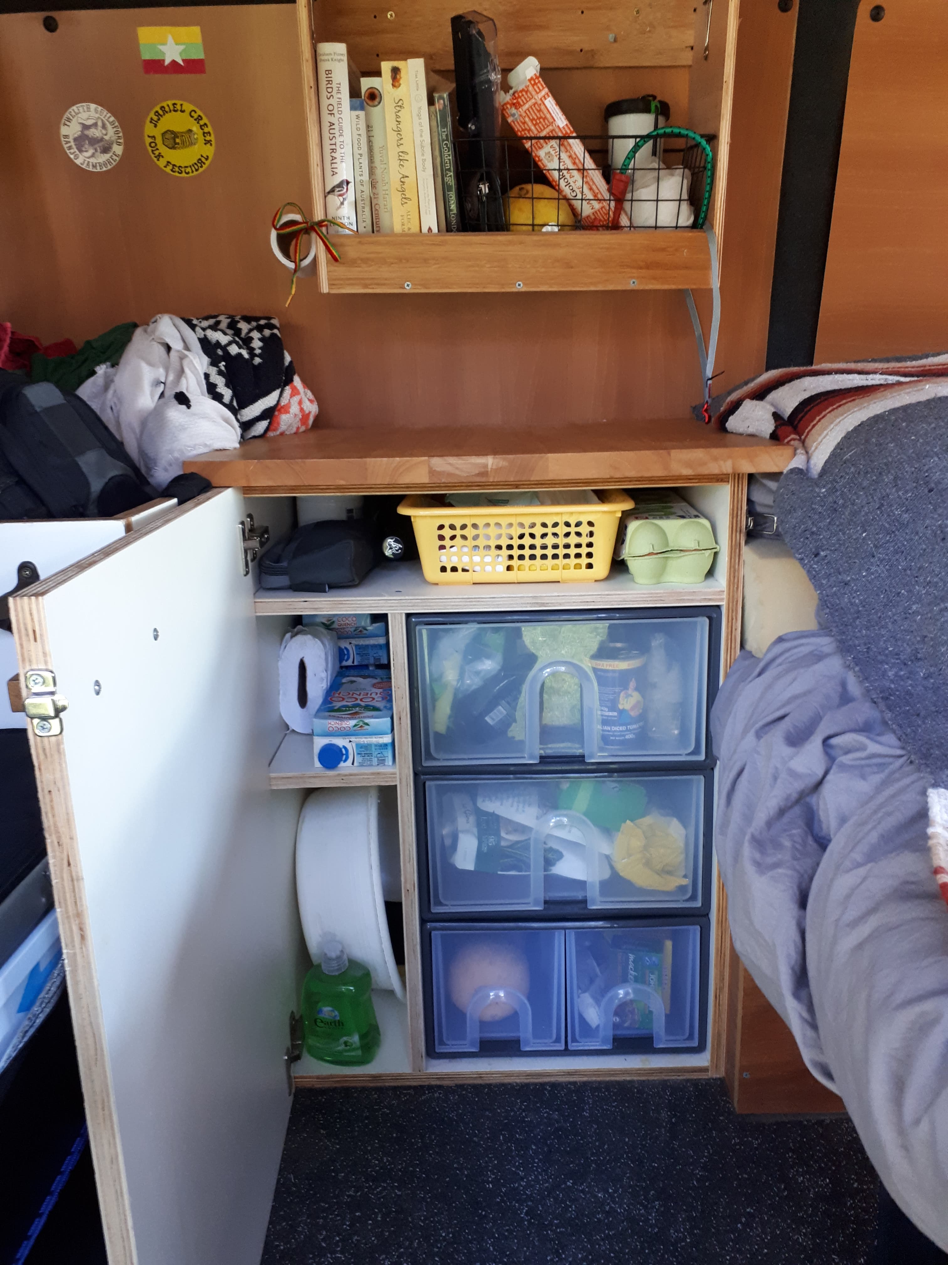 The slide out drawers are easy to clean and fit alot of food. The top shelf in this cupboard has first aid, and other sundries like playing cards, earplugs, bushcraft knives and tucked up the back, a few bottles of wine.