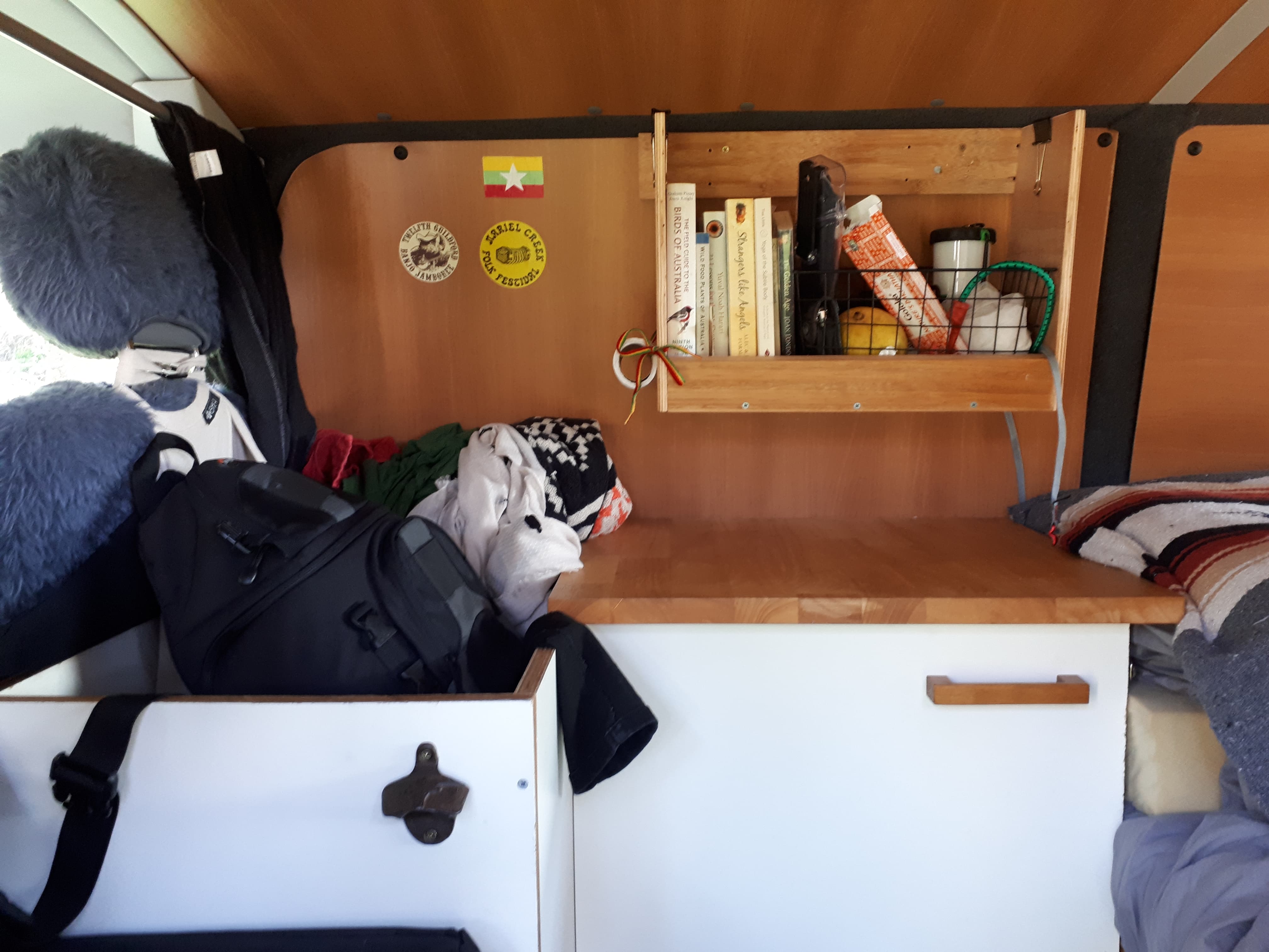 In every vehicle I've lived in (and there's been a few we have had room for books, so this one is no different. I also have a wire basket there for fruit - on this trip, mangoes and avocadoes. If we carry more books, this gets taken out and strapped to the table underneath with an octopus strap.