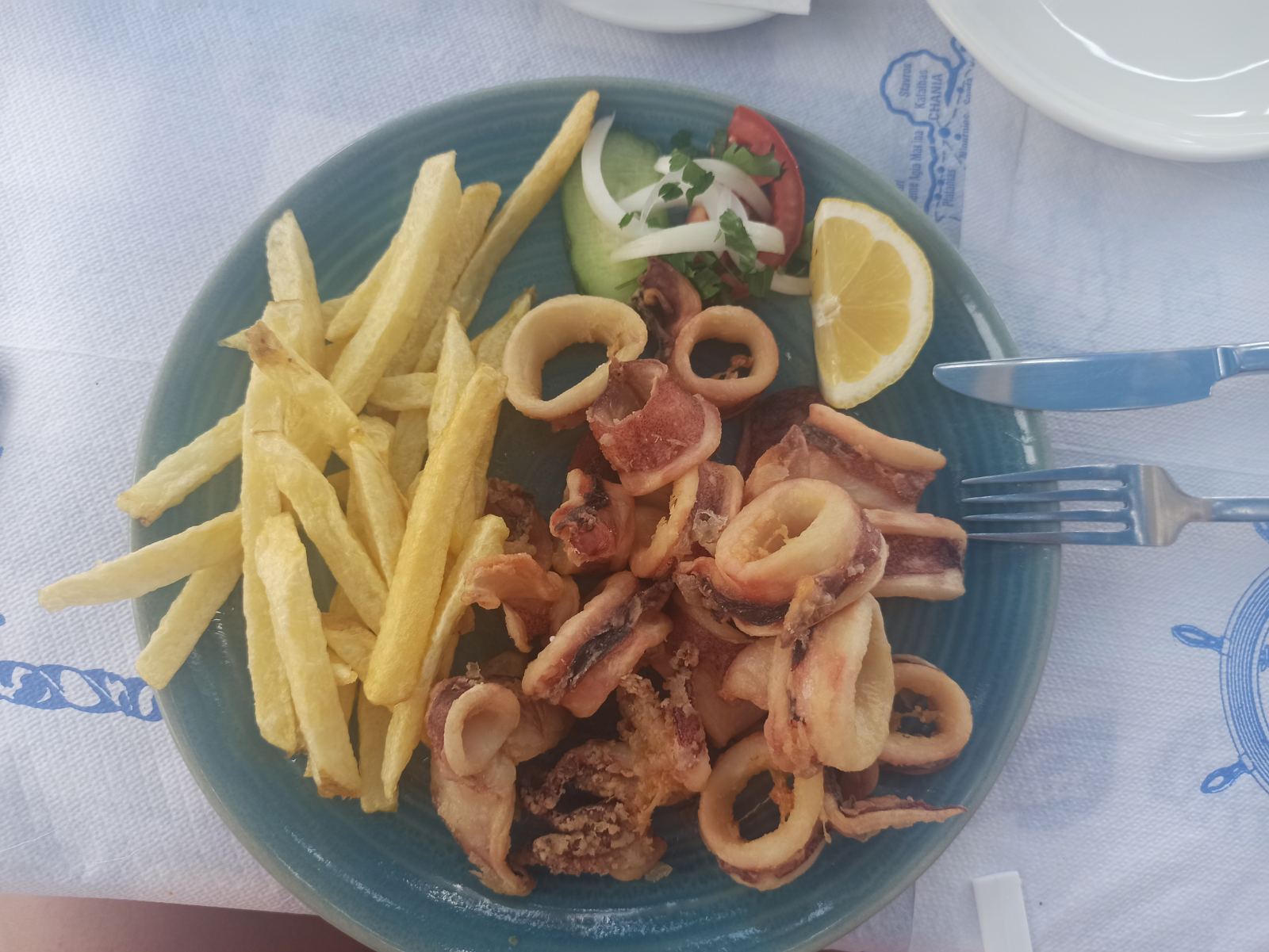 Этот год полон событий, и мы с семьёй решили отвлечься от всего, отдохнуть от работы и отправились на курорт. В этом году наш выбор пал на Грецию. Недолго думая, мы купили билеты на 12 дней. Попали мы на остров Крит, в местечко под названием Ба́ли. Вообще этот городок называется Балеон, но местные величают его как курорт-мечту каждого. И, конечно, первое, что мы сделали после исследования отеля, моря и заселения, это поиск места, где можно вкусно покушать. Сначала мы пытались сделать это в отдельном ресторанчике, но еда там была не сильно вкусная. И тогда мы выбрали произвольное направление и двинулись, чтобы что-то перекусить. Искали мы недолго. Уже через 20 минут ходьбы перед нами стояла с виду ничем не примечательная таверна Psaropoula. Целью нашего первого заказа было проверить, насколько тут вообще вкусно. На мой заказ мне принесли замечательные жареные кольца кальмара в панировке с картошкой фри.