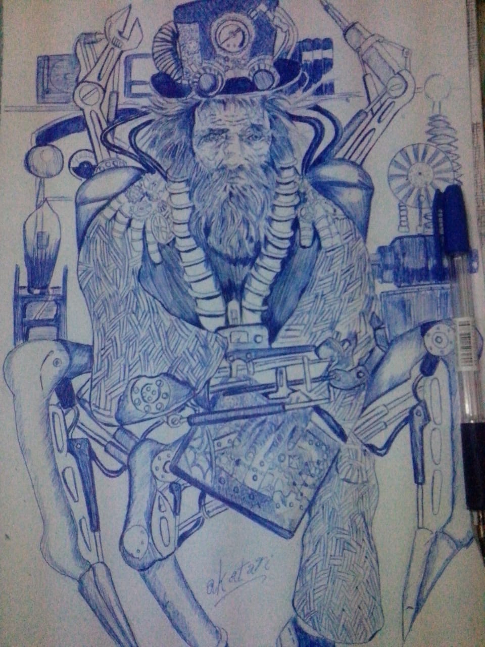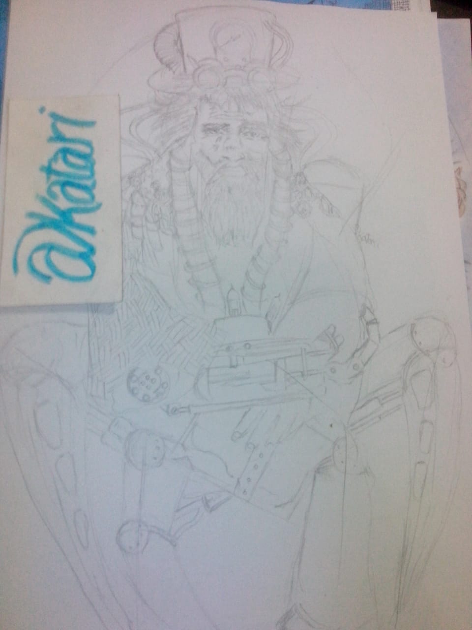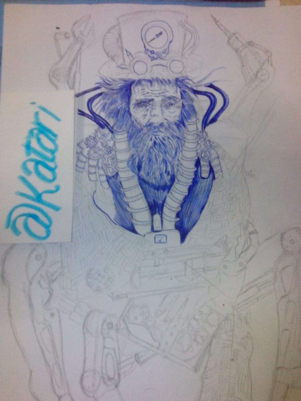 Hello friends of steemit this time, I bring you my entry for trial By comic, organized by our friend @kommienezuspadt, I really did not know if I was going to give time to be part of this contest on this occasion, because I had some projects I was developing , but at least it took me time to make an entry, with this character that I did something quick, sketch on some drafts, in an old notebook where I do some quick sketches to capture my main ideas, this character represents a bit for some things that I've always been inspired since I was a child, as inventors, robots, and things that always hovered around my mind, and because of the drawings I always saw and some futuristic films, I think it also influences me reading some of Julio's novels Verne, when creating this character that has a very steampunk theme, and for the things that I do every day that I am always surrounded by transistors, cables and circuits, the drawing he creates for this occasion is an old inventor, of which he is already half robot and half human being, being parts of his extremities replaced by mechanical parts for your better mobility as seen by mechanical legs that act by a pneumatic system, and pneumatic arms that help you perform better jobs as they are members that can replace and adapt as appropriate, I hope you like the character created by me for this occasion.